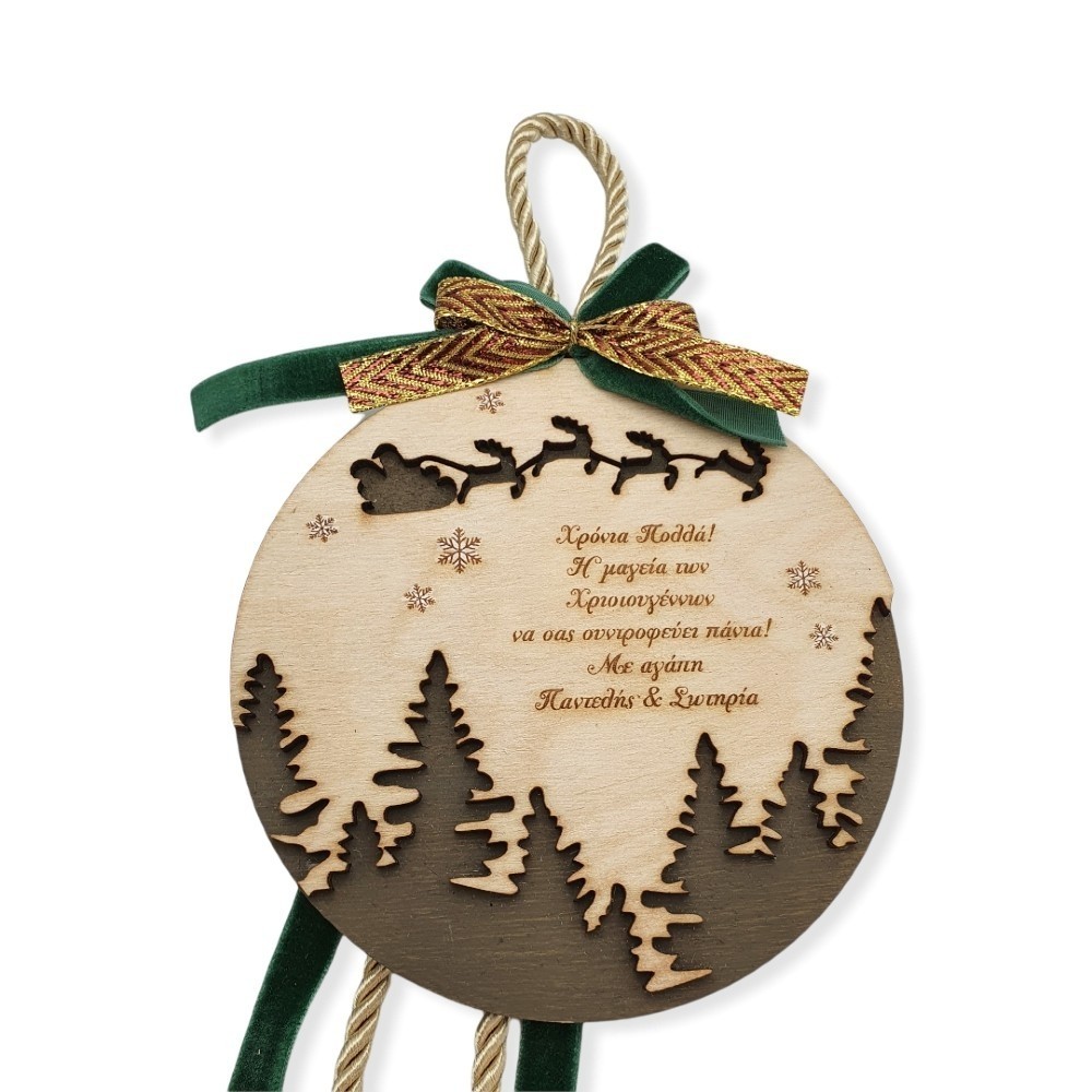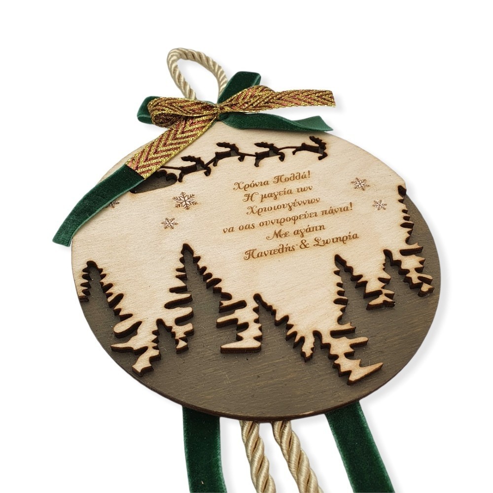 Πρωτότυπο ξύλινο χειροποίητο γούρι υψηλής αισθητικής, με δύο επιφάνειες ξύλου που τις ενώνουμε και δημιουργείται μια αναπαράσταση με ένα δάσος από έλατα και από πάνω να περνάει πετώντας με το έλκηθρό του ο Άγιος Βασίλης ! Η κάτω επιφάνεια είναι βαμμένη για να αναδεικνύει την αναπαράσταση, ενώ ή πάνω είναι χαραγμένη με αφιέρωση της επιλογής σας και νιφάδες χιονιού. Διακοσμημένο με κορδόνι, βελούδινη κορδέλα και φιογκάκια!