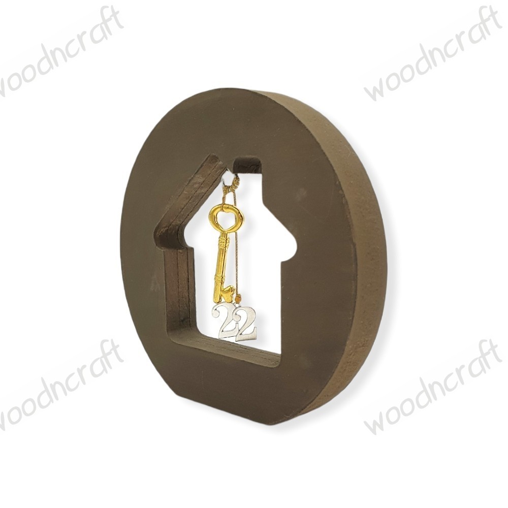 Χειροποίητο αυτοστηριζόμενο γούρι από χοντρό ξύλο σε κυκλικό σχήμα με διάτρητο σπιτάκι στο κέντρο του, που μέσα του κρέμονται ένα μεταλλικό κλειδί σε χρυσό χρώμα και μεταλλικοί αριθμοί σε ασημί χρώμα που σχηματίζουν το νέο έτος! Βάφεται στο χέρι στο χρώμα της επιλογής σας.