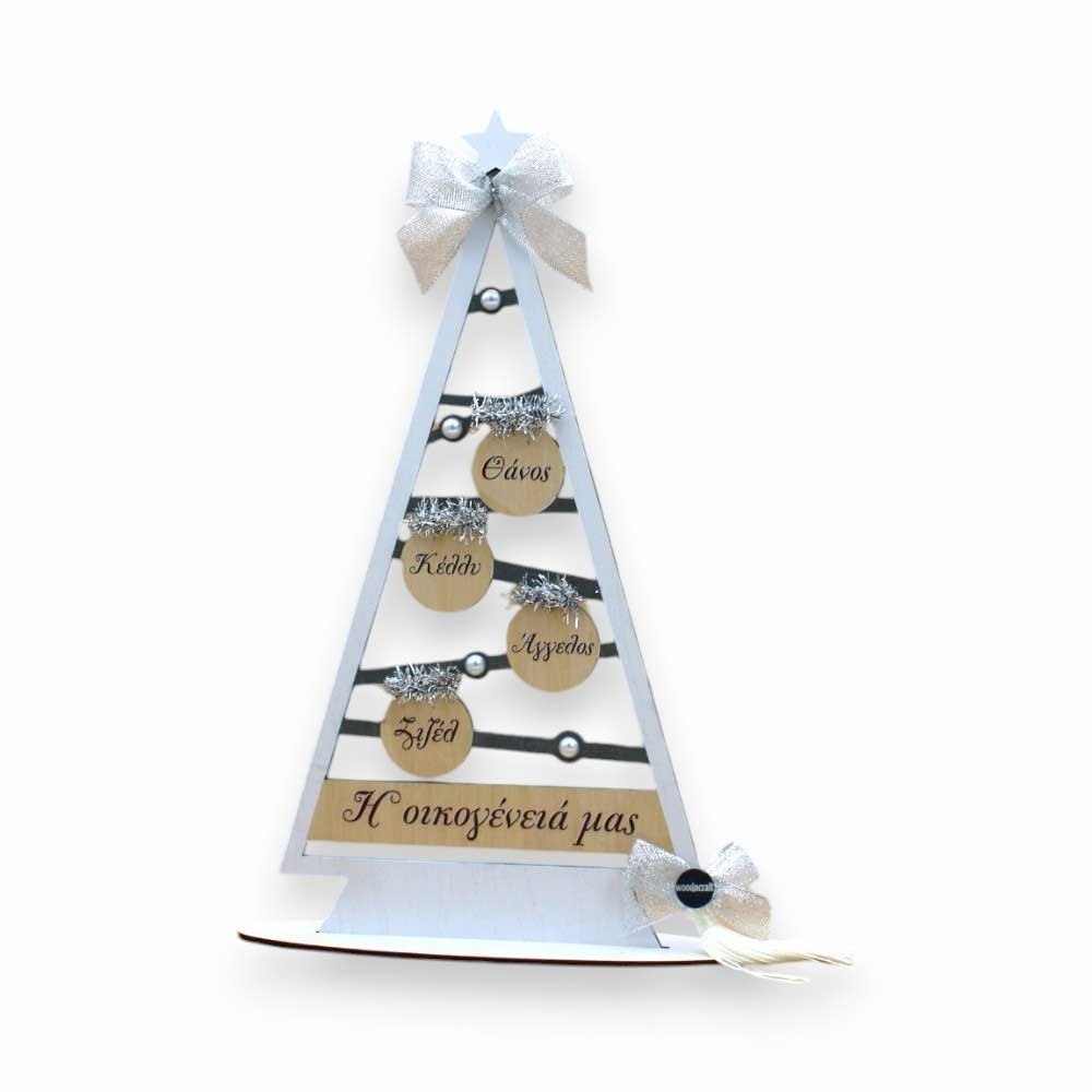 Ξεχωριστό ξύλινο χριστουγεννιάτικο διακοσμητικό έλατο με προσαρμοσμένες μπαλίτσες χαραγμένες με τα ονόματα της δικής σας οικογένειας! Διακοσμημένο με κορδελάκια, πέρλες και φουντίτσα!