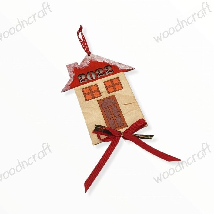 Πρωτότυπο ξύλινο χειροποίητο γούρι σε σχέδιο σπιτάκι με διάτρητα νουμεράκια από την χρονιά που μας έρχεται και διακοσμημένο με κορδελάκια!