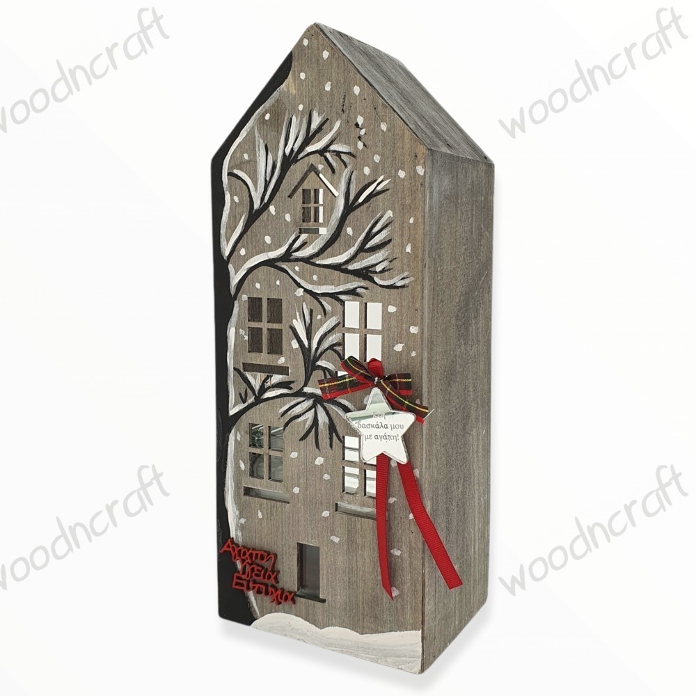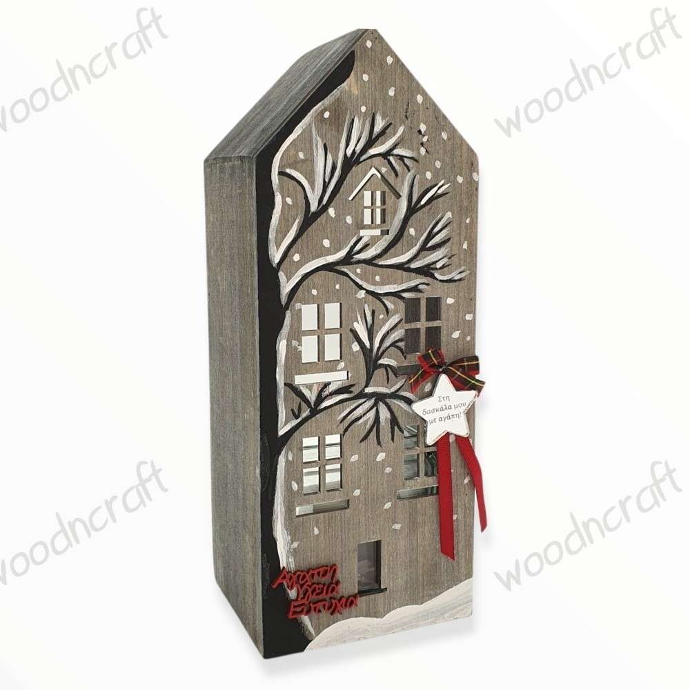 Ξύλινο χριστουγεννιάτικο διακοσμητικό σπιτάκι - κηροπήγιο ζωγραφισμένο στο χέρι και προσωποποιημένο με την δική σας αφιέρωση, χαραγμένη σε ένα καθρέφτη πλεξιγκλάς αστεράκι! Ένα ξεχωριστό χρηστικό δωράκι για να διακοσμήσετε τον χώρο σας ή για να χαρίσετε στα άτομα που αγαπάτε!