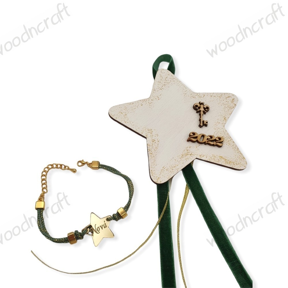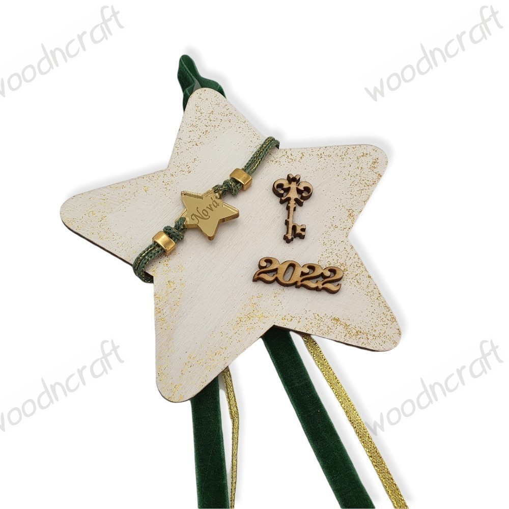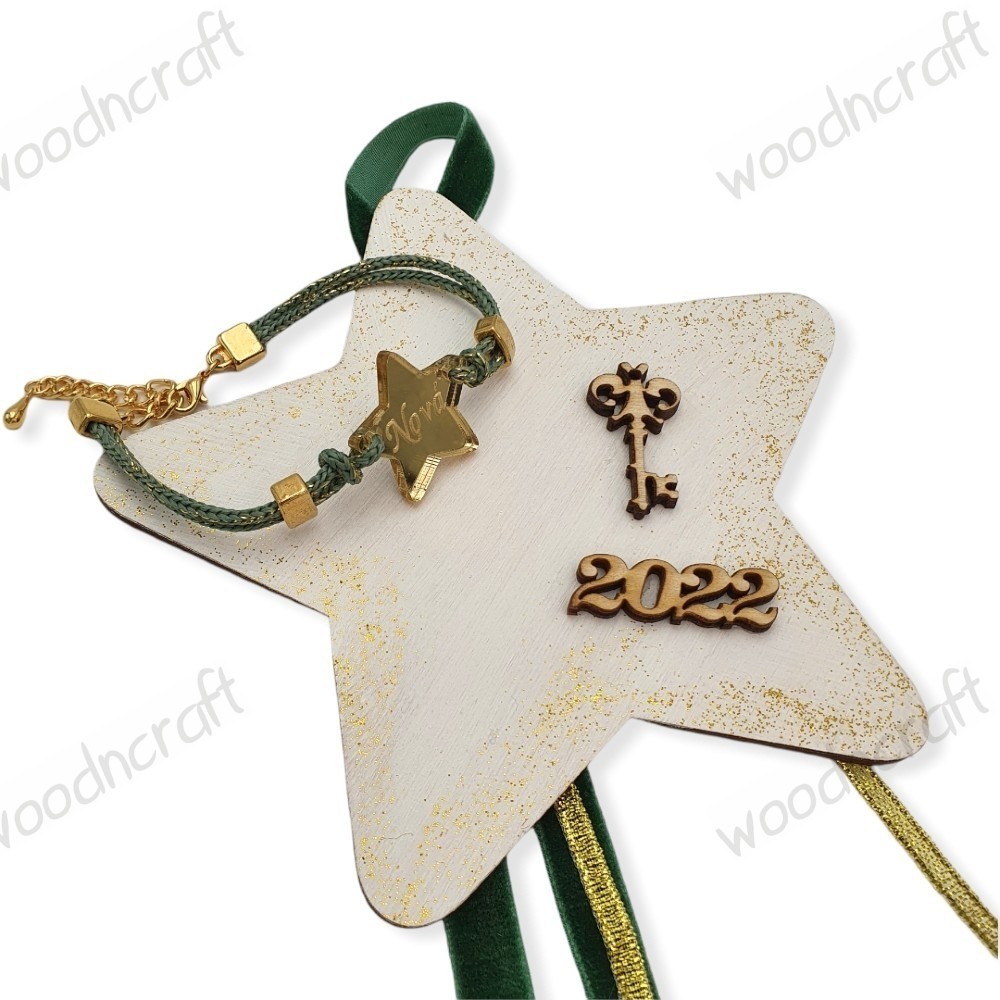 Πρωτότυπο σετ δωράκι για τους αγαπημένους σας αποτελούμενο από χειροποίητο γούρι αστέρι με χρυσόσκονη, ξύλινο κλειδί και κοπτικό 2022, και χειροποίητο βραχιόλι με αστεράκι από χρυσό καθρέφτη πλεξιγκλάς χαραγμένο με το άτομο που θέλετε να χαρίσετε το δωράκι!