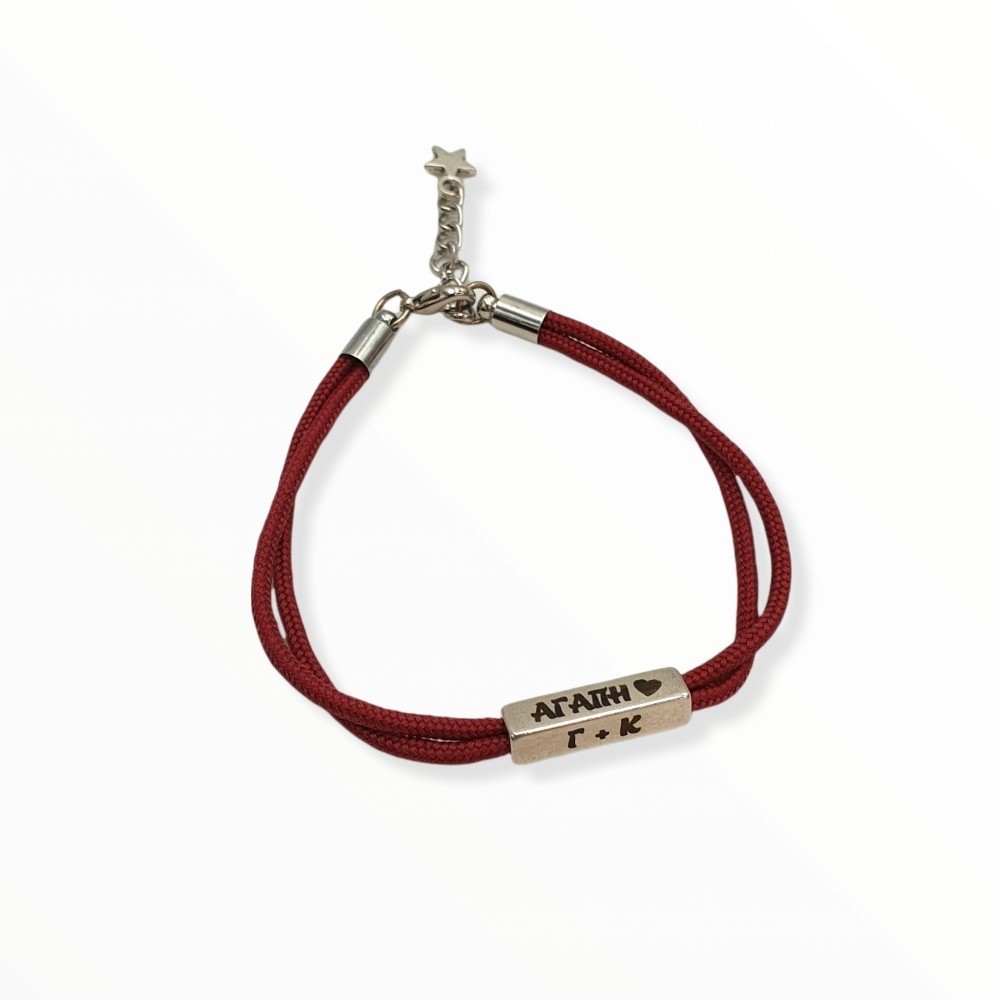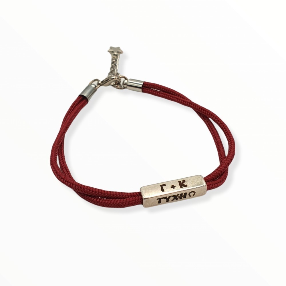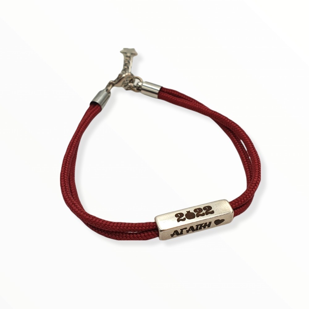 Μοναδικό χειροποίητο βραχιόλι - γούρι προσωποποιημένο με μεταλλική μπάρα με 4 πλευρές οι οποίες είναι χαραγμένες με τις ευχές αγάπη και τύχη, με ένα καλότυχο 2022 και φυσικά με τα αρχικά ή το όνομα της επιλογής σας! Φτιαγμένο με κορδόνι, μεταλλικό κούμπωμα και κρεμαστή αλυσίδα με αστεράκι!