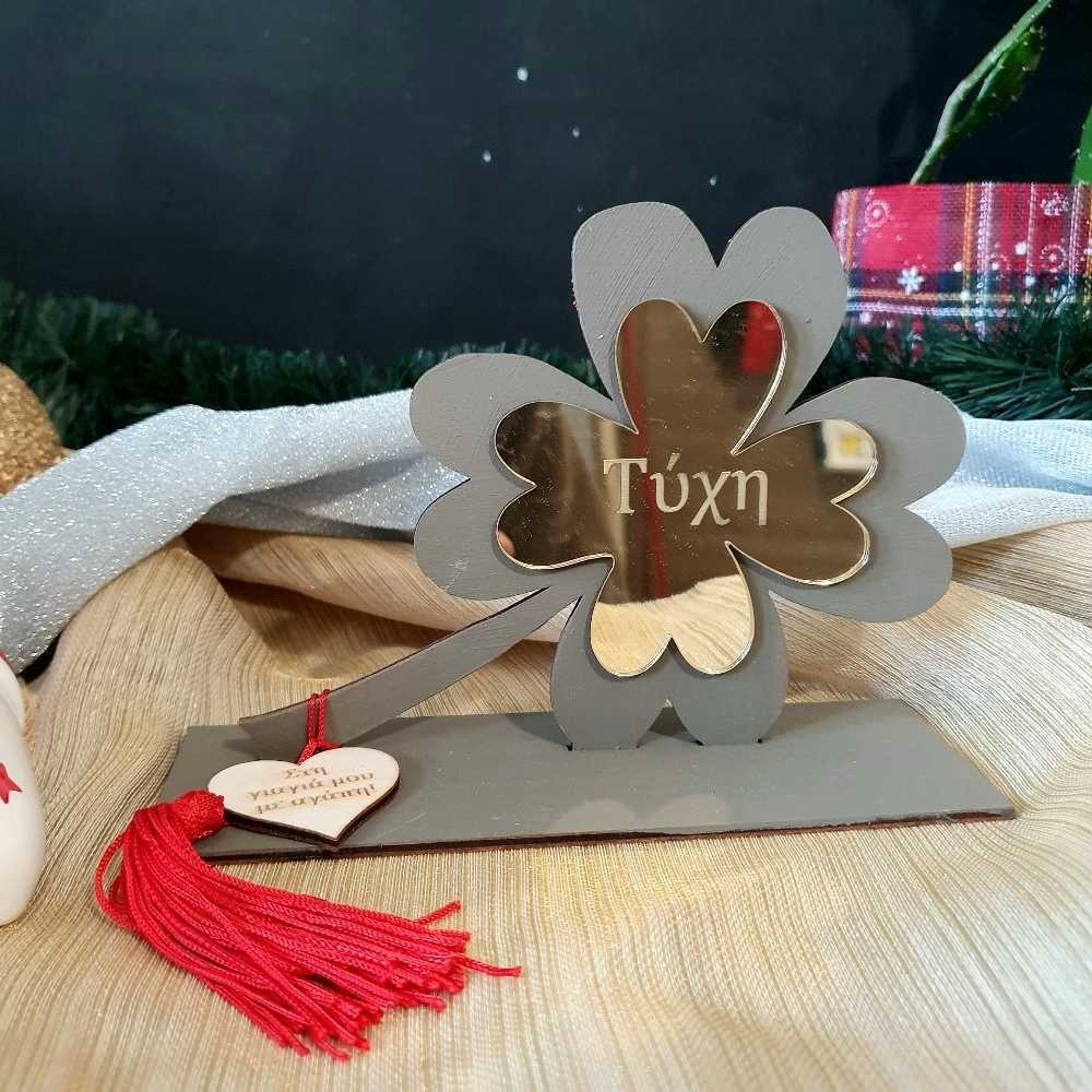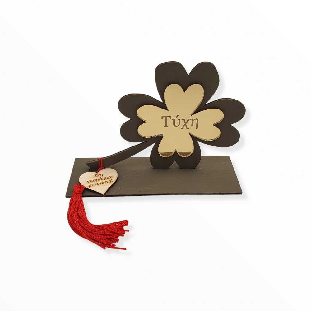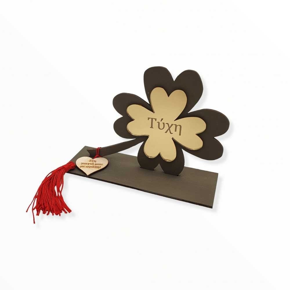 Χειροποίητο επιτραπέζιο γούρι - τριφύλλι φτιαγμένο με τον συνδυασμό ξύλου και χρυσού καθρέφτη πλεξιγκλάς στηριζόμενο σε βάση... έτοιμο να κλέψει τις εντυπώσεις! Τα ξύλινα μέρη (πλάτη και βάση) μπορούν να γίνουν στα χρώματα που επιθυμείτε, το πλεξιγκλάς τριφύλλι είναι χαραγμένο με την ευχή "Τύχη" και στη βάση υπάρχει μια ξύλινη καρδούλα διακοσμημένη με κόκκινη φουντίτσα και χαραγμένη με την αφιέρωση της επιλογής σας!
