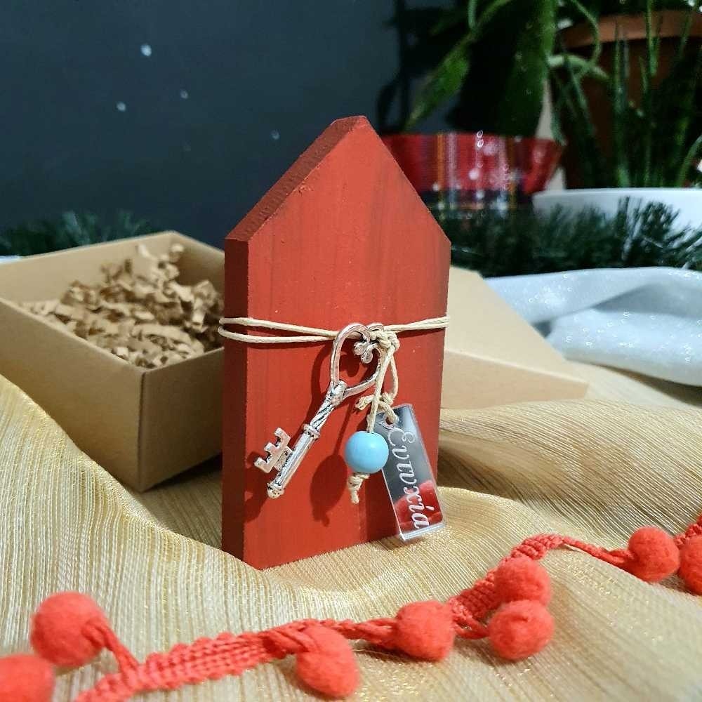 Χειροποίητο ξύλινο επιτραπέζιο γούρι σε σχέδιο σπιτάκι διακοσμημένο με σπάγκο, μεταλλικό κλειδί και πλεξιγκλάς ασημί ταμπελάκι χαραγμένο με την ευχή "Ευτυχία".