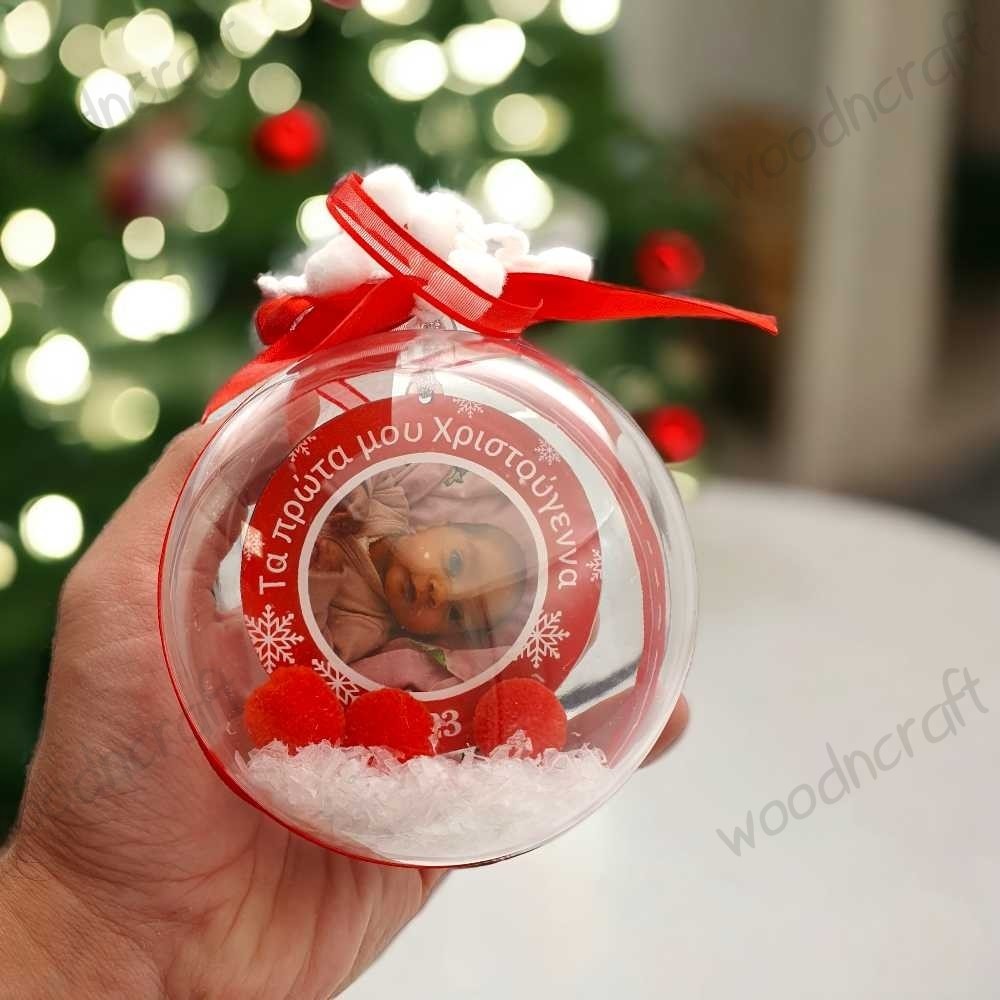 Διαφανής και λαμπερή, σαν να παγιδεύτηκε μέσα της ένα κομμάτι του χειμωνιάτικου ουρανού, γεμάτη με διακοσμητικό χιόνι, χνουδωτές μπαλίτσες και ένα ξύλινο στολίδι που αγκαλιάζει την φωτογραφία του μωρού σας - την καρδιά αυτής της δημιουργίας.