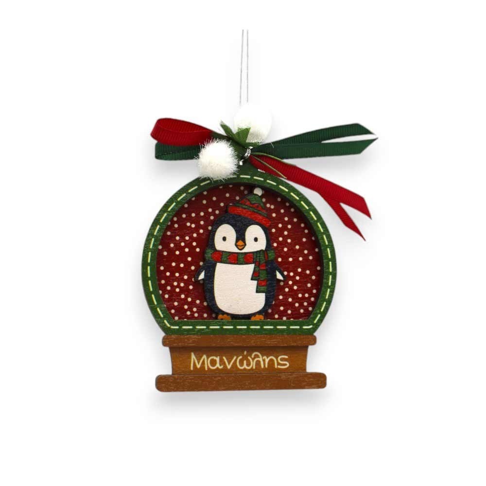 Στο κέντρο του στολιδιού, ένας χαριτωμένος πιγκουίνος φοράει χριστουγεννιάτικο κασκόλ και σκούφο, ενώ κάτω από αυτόν τυπώνεται το όνομα της επιλογής σας, καθιστώντας το μοναδικό και προσωπικό. Διακοσμημένο με δύο κορδελάκια και δύο χνουδωτές μπαλίτσες, προσφέρει μια ζεστή και γιορτινή ατμόσφαιρα.