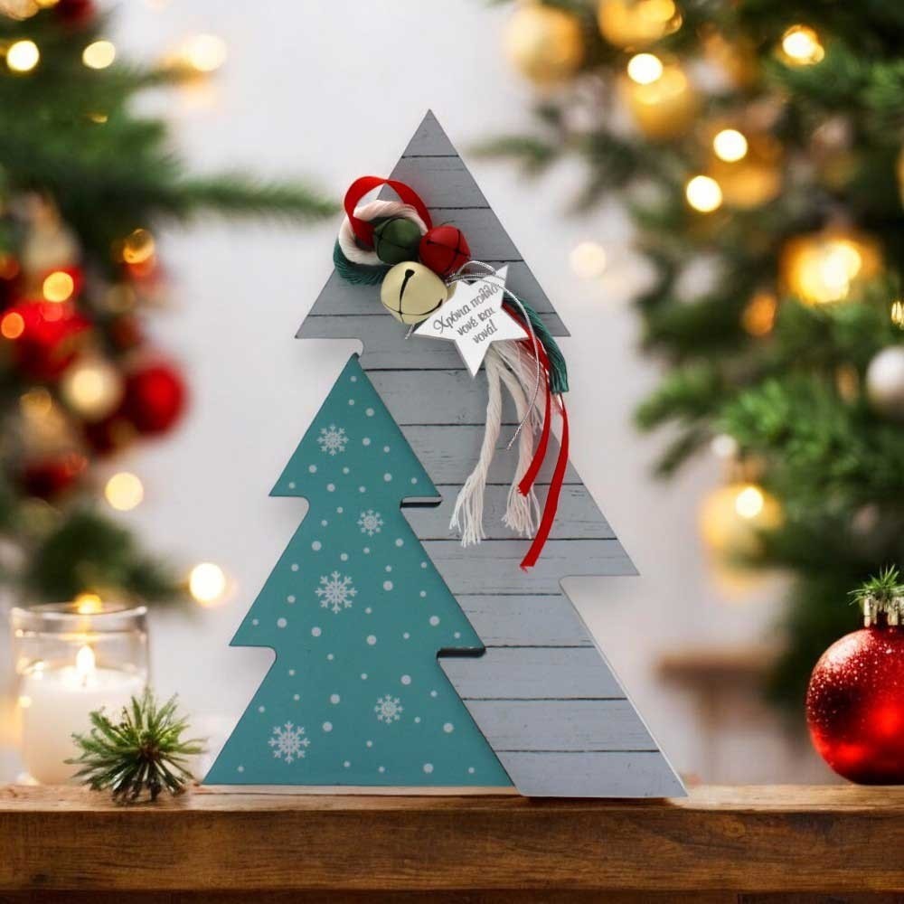 Ξύλινο επιτραπέζιο χριστουγεννιάτικο διακοσμητικό με 2 δέντρα ενωμένα φτιαγμένα από χοντρό ξύλο και με εκτύπωση UV!