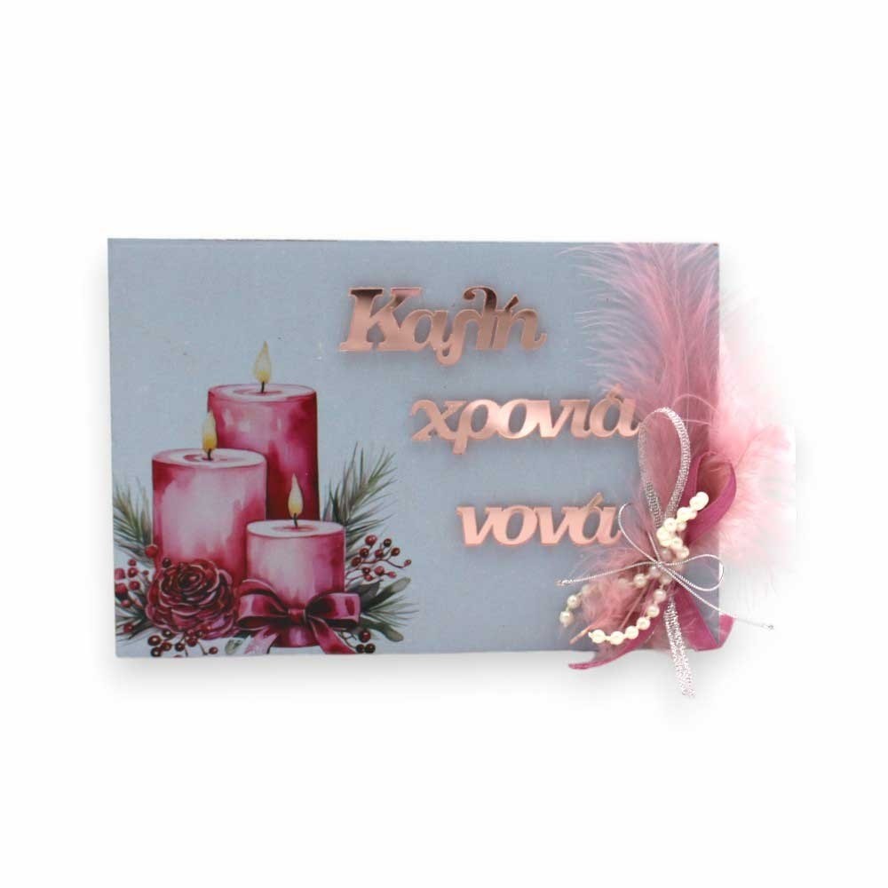 Ξύλινο γούρι με εκτύπωση UV, διαστάσεων 17 x 12 εκ., που φέρει τη φράση "Καλή χρονιά νονά" με γράμματα από ροζ-χρυσό πλεξιγκλάς καθρέφτη. Είναι διακοσμημένο με ροζ φτερά, κορδέλες και πέρλες, δημιουργώντας μια κομψή και ρομαντική σύνθεση. Ένα ξεχωριστό δώρο για τη νονά, ιδανικό για να εκφράσετε την αγάπη και τις ευχές σας με στυλ και φινέτσα.