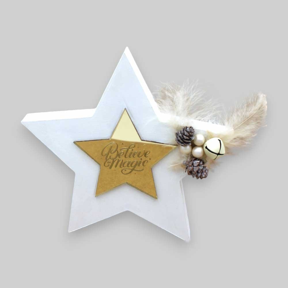 Αυτό το μοναδικό επιτραπέζιο διακοσμητικό είναι κατασκευασμένο από ξύλο και φέρει ένα χρυσαφί καθρέφτη από πλεξιγκλάς στο σχήμα αστεριού, στο κέντρο του οποίου υπάρχει η φράση **"Believe in Magic"**.