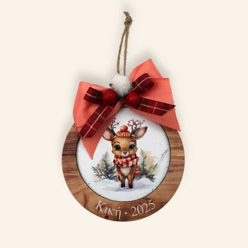 Μοναδικό ξύλινο χειροποίητο στολίδι κύκλος με στεφανάκι και έξτρα κολλημένο ένα ξύλινο παιδικό φορμάκι στο χρώμα της επιλογής σας με χάραξη Τα πρώτα μου Χριστούγεννα, διακοσμημένο με ανάλογα κορδελάκια.