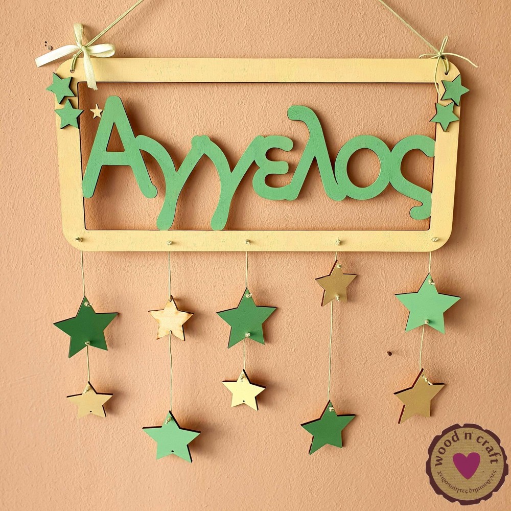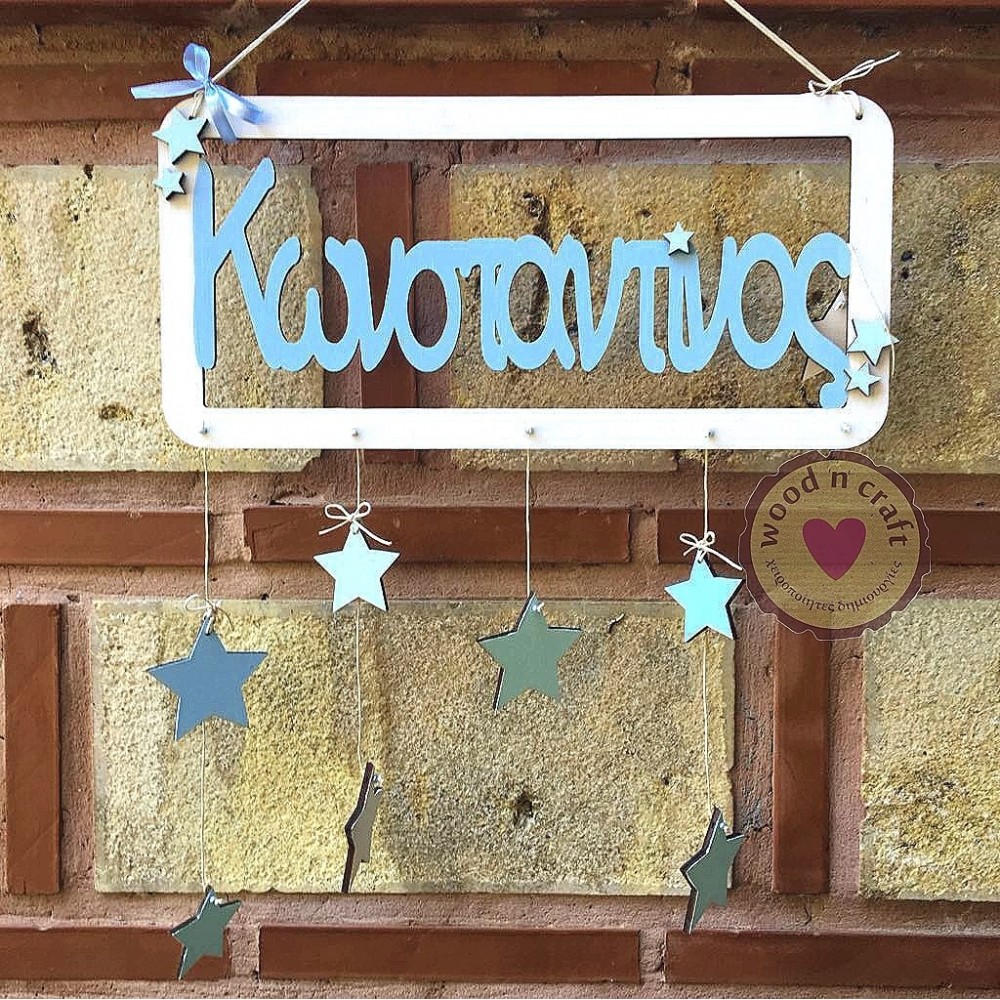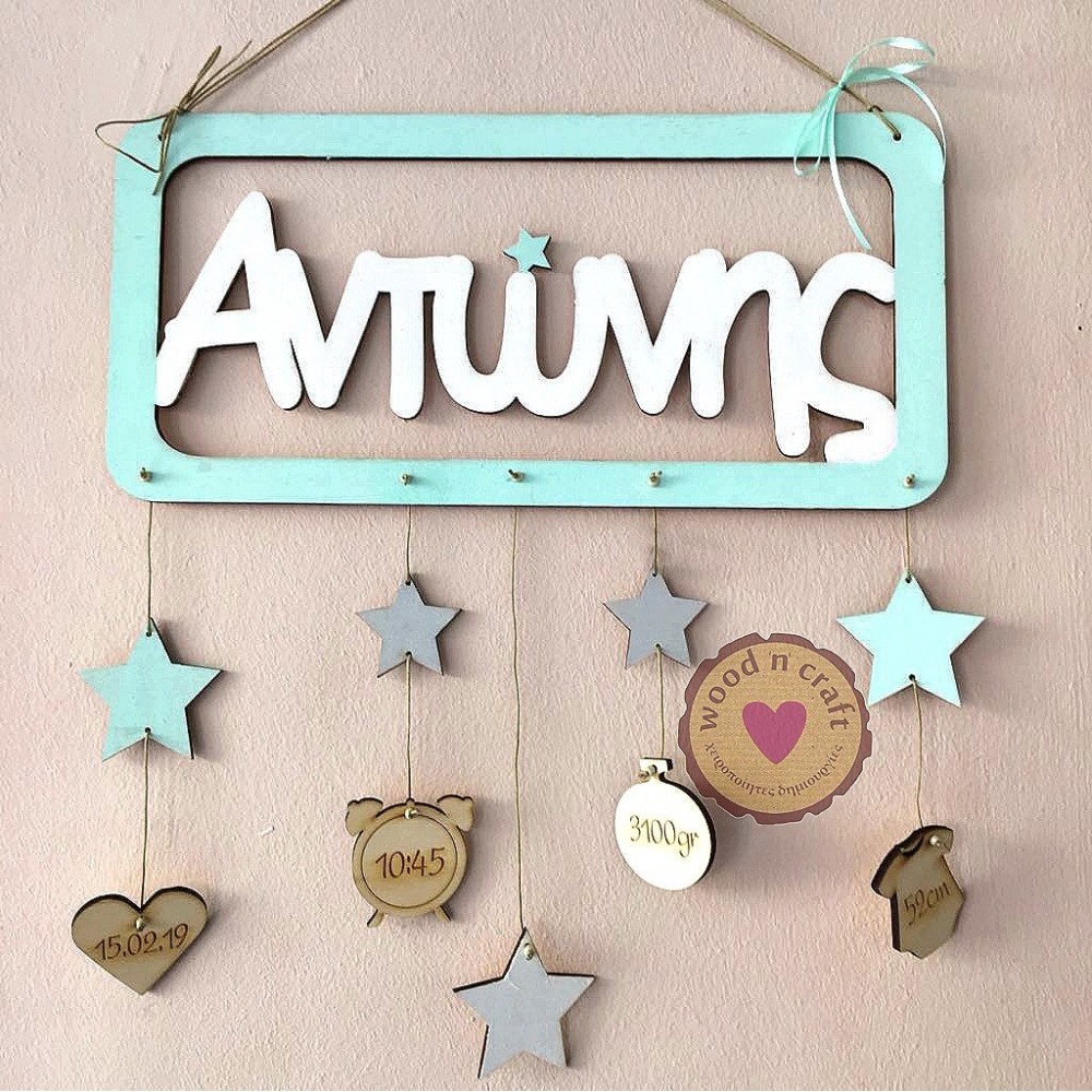 Μοναδικό ξύλινο χειροποίητο κρεμαστό ενθύμιο γέννησης με το όνομα του παιδιού προσαρμοσμένο μέσα σε πλαίσιο, κρεμαστά αστεράκια βαμμένα ή χαραγμένα με ευχές ή τα στοιχεία γέννησης του παιδιού.