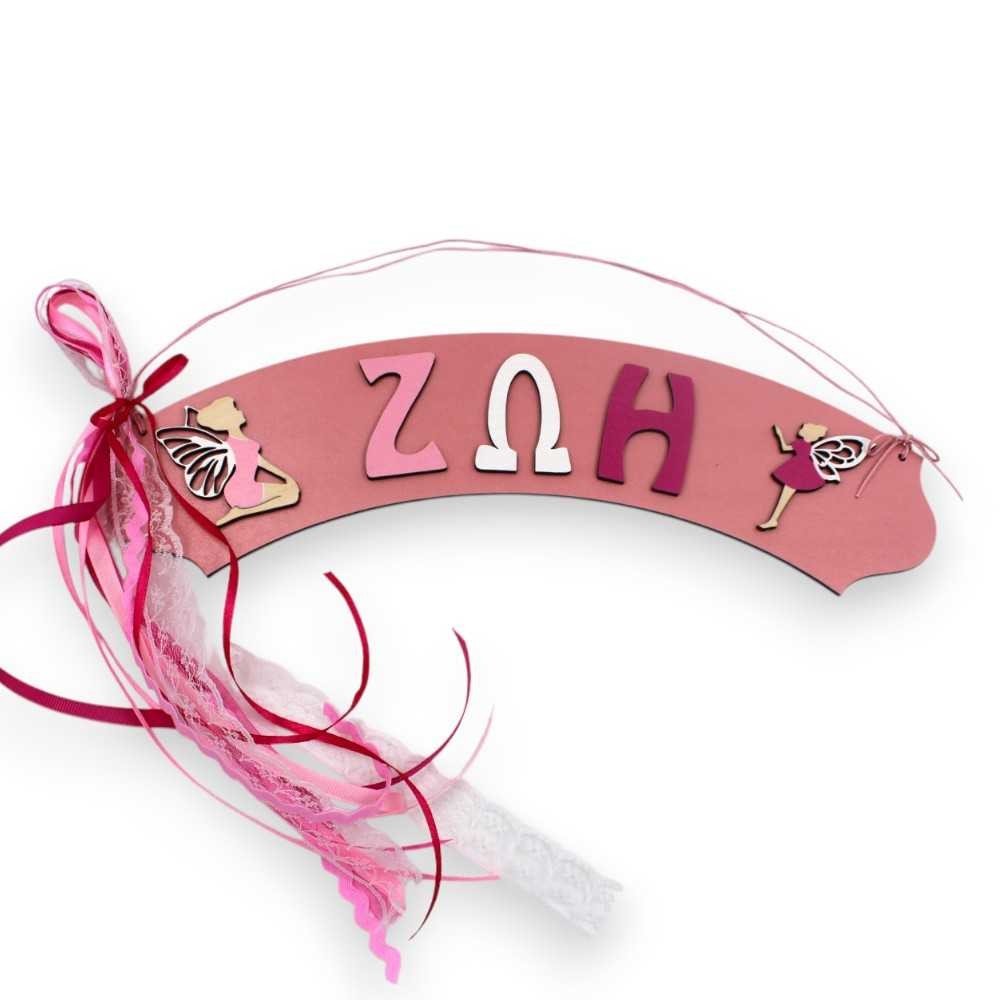 Μοναδική ξύλινη χειροποίητη πινακίδα με γράμματα που σχηματίζουν το όνομα του παιδιού ανάμεσα από δύο γλυκιές αντικρυστές νεράιδες! Βαμμένο στο χέρι σε χρώματα της επιλογής σας και διακοσμημένο με ανάλογα κορδελάκια. Ιδανικό για να διακοσμήσετε την πόρτα του παιδικού δωματίου!