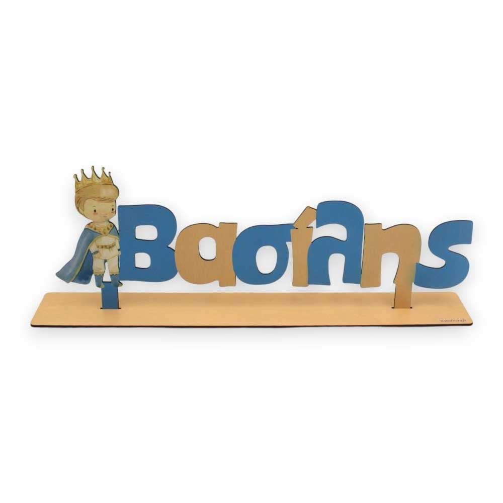 Δώστε μια παιχνιδιάρικη και γλυκιά νότα στο χώρο του παιδιού σας με αυτό το χαριτωμένο ξύλινο διακοσμητικό! Το όνομα του παιδιού σας προσαρμόζεται με όμορφο τρόπο πάνω σε έναν γλυκούλη πρίγκιπα, κάνοντας αυτό το διακοσμητικό ιδανικό για στολισμό βάπτισης ή γενεθλίων, για ένα ξεχωριστό δώρο σε παιδί ή για να ομορφύνετε το παιδικό δωμάτιο.