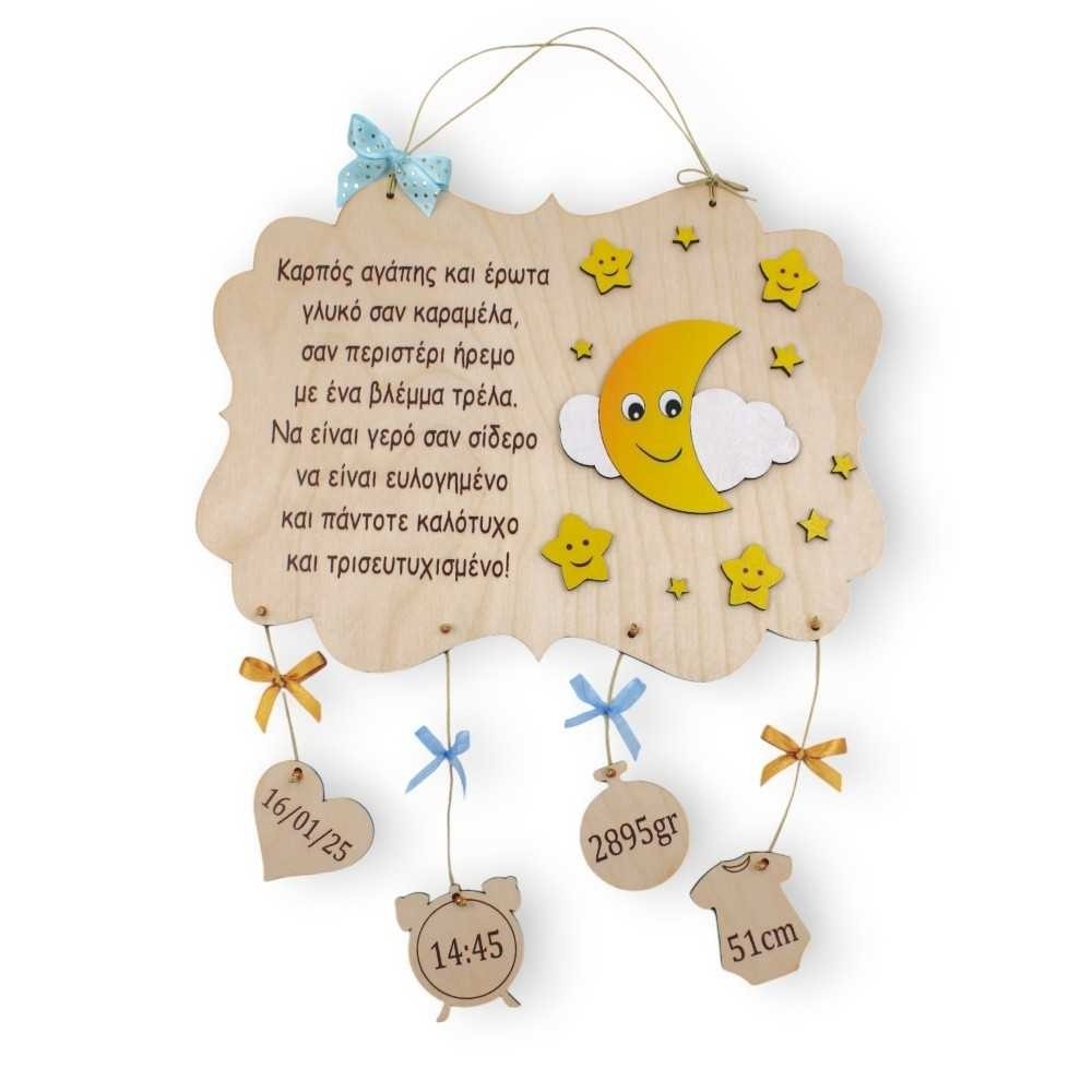 Πρωτότυπο ξύλινο αναμνηστικό καδράκι με όνομα, χαραγμένες ευχές και κρεμαστά στοιχεία γέννησης. Ένα πρωτότυπο ενθύμιο γέννησης διακοσμημένο με φεγγαράκι, αστέρια και ταιριαστά κορδελάκια που κρατάει χαραγμένες τις ευχές σας για αυτήν την τόσο σημαντική στιγμή!