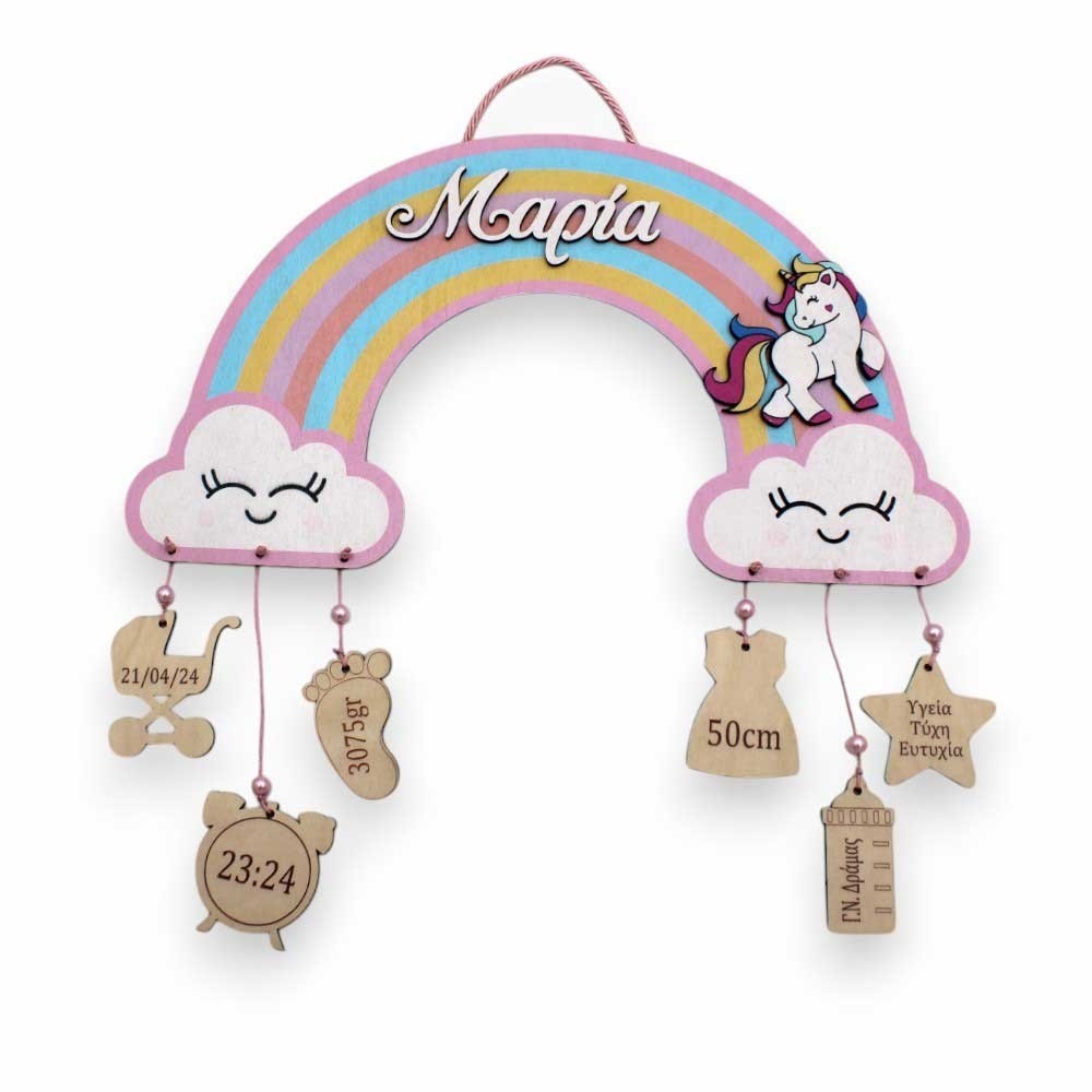 Ξύλινο ενθύμιο γέννησης - Ουράνιο τόξο με σύννεφα και μονόκερο