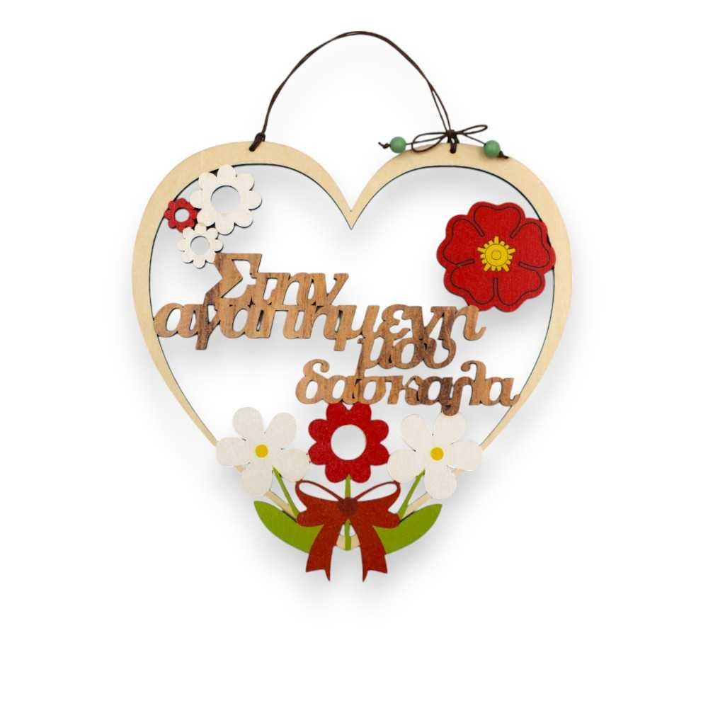 Ξύλινη χειροποίητη διακοσμητική καρδιά με λουλούδια και αφιέρωση στην αγαπημένη μου δασκάλα.