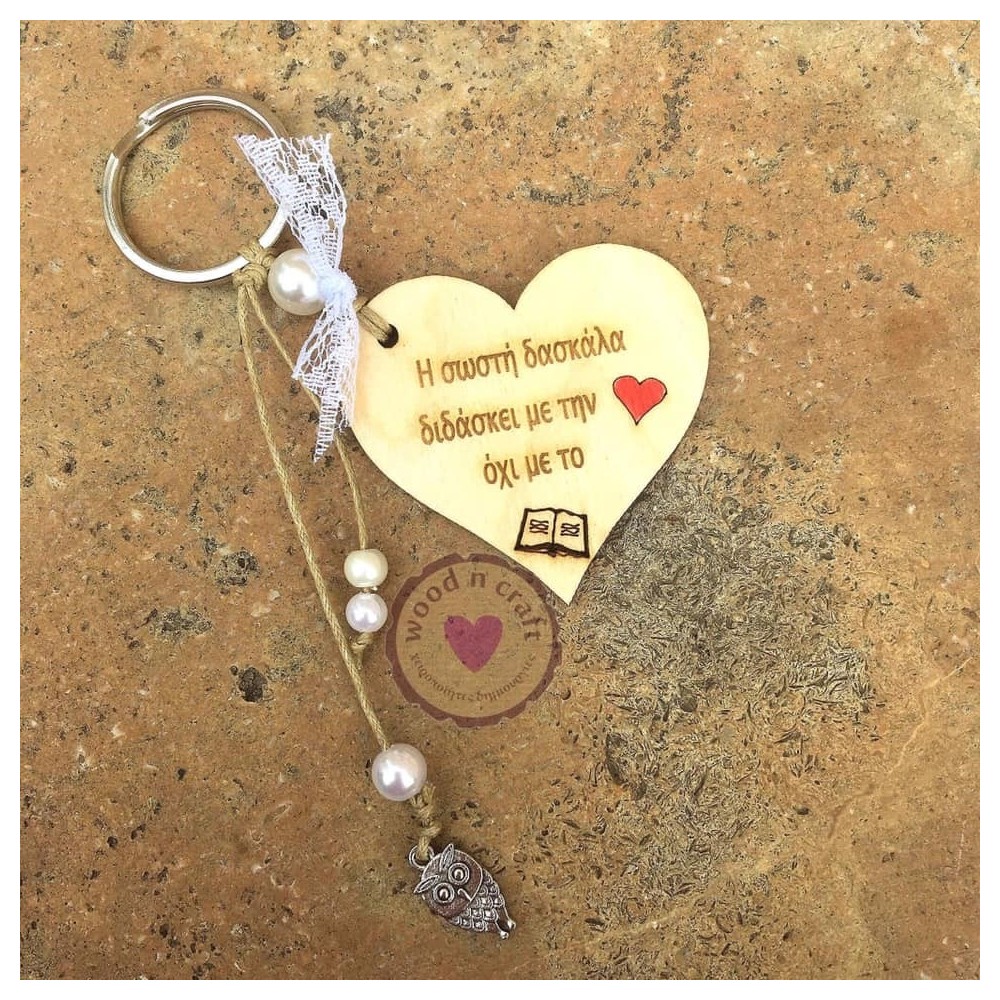 Μοναδικό ξύλινο χειροποίητο μπρελόκ σε σχήμα καρδιάς με αφιέρωση για την καλύτερη δασκάλα του κόσμου. Διακοσμημένο με φιογκάκι, λευκές πέρλες και μια κρεμαστή κουκουβάγια!