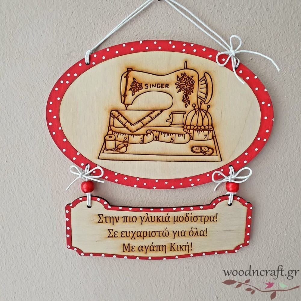 Πρωτότυπο ξύλινο χειροποίητο καδράκι με χαραγμένη ραπτομηχανή και την προσωπική σας αφιέρωση. Βαμμένο περίγραμμα σε χρώμα της επιλογής σας και διακοσμημένο με ανάλογες χάντρες και κορδονάκι!