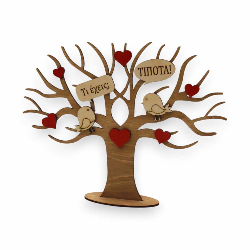 Ξεχωριστό και αγαπησιάρικο ξύλινο δεντράκι σε βάση με ένα ερωτευμένο ζευγάρι πουλάκια πάνω σε μια στιγμή διαφωνίας. Διακοσμημένο με καρδούλες και βαμμένο σε χρώματα της επιλογής σας. Ένα πρωτότυπο και παιχνιδιάρικο δωράκι που σίγουρα θα εντυπωσιάσει.