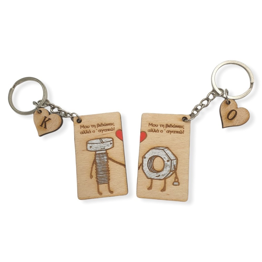Μοναδικό και ξεχωριστό παιχνιδιάρικο σετάκι από ξύλινα μπρελόκ σε σχέδιο βίδα και παξιμάδι πιασμένα χέρι χέρι, με μια καρδιά ανάμεσά τους και χαραγμένη την αφιέρωση "Μου τη βιδώνεις αλλά σ'αγαπώ" Φτιαγμένα με αλυσίδα και μεταλλικά κρικάκια ασημί χρώματος και διακοσμημένα με ξύλινες καρδούλες χαραγμένες με τα αρχικά σας.