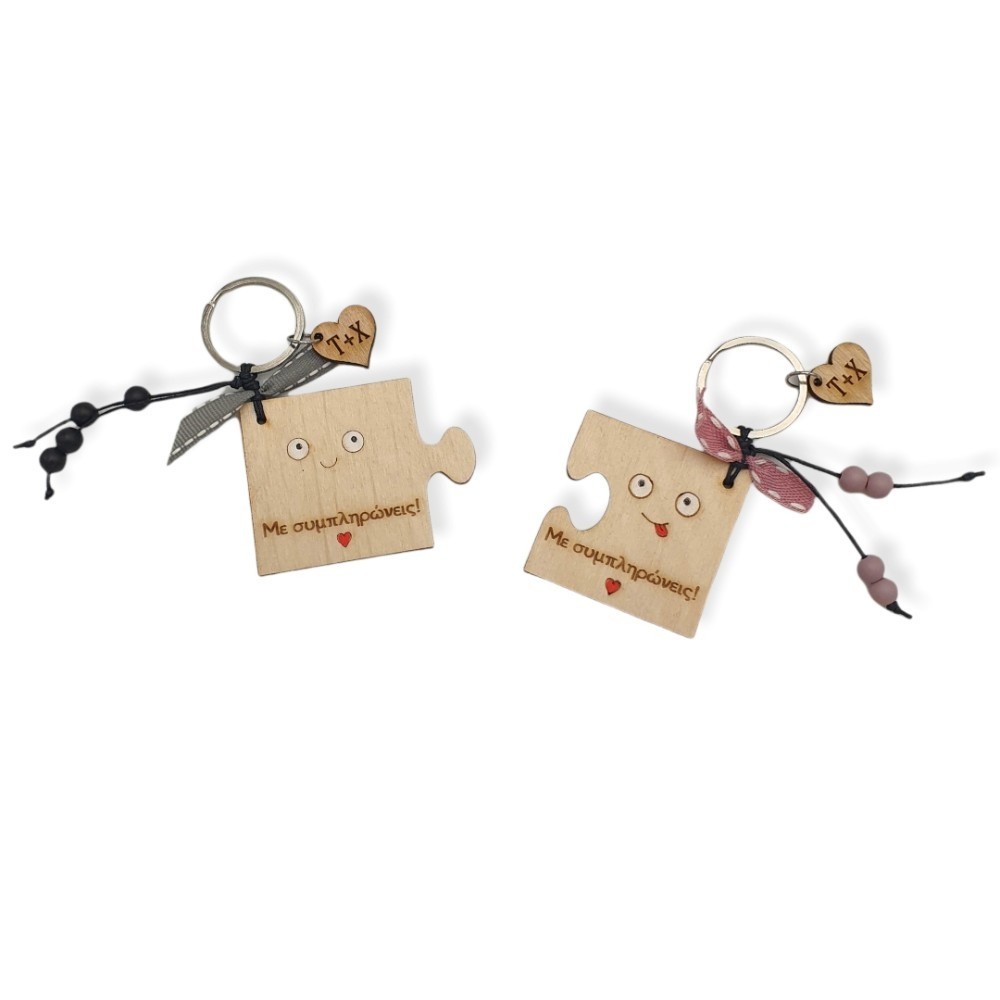 Πρωτότυπο, παιχνιδιάρικο σετάκι από ξύλινα μπρελόκ σε σχήμα κομμάτια puzzle που ενώνονται και είναι χαραγμένα με χαρούμενες φατσούλες με τη φράση "με συμπληρώνεις"! Το κάθε μπρελόκ είναι φτιαγμένο με μεταλλικούς κρίκους σε ασημί χρώμα και διακοσμημένο με κορδελάκι, χάντρες και ξύλινη καρδούλα χαραγμένη με τα μονογράμματά σας!