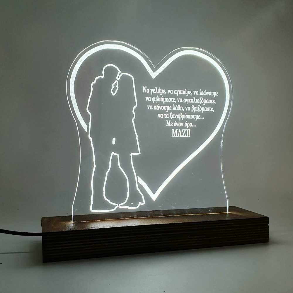 Xειροποίητο επιτραπέζιο φωτιστικό από διάφανο plexiglass υψηλής αισθητικής σε σχέδιο καρδιάς με ένα ερωτευμένο ζευγάρι και το κείμενο της επιλογής σας! Ένα μοναδικό φωτιστικό τοποθετημένο σε ξύλινη βάση
