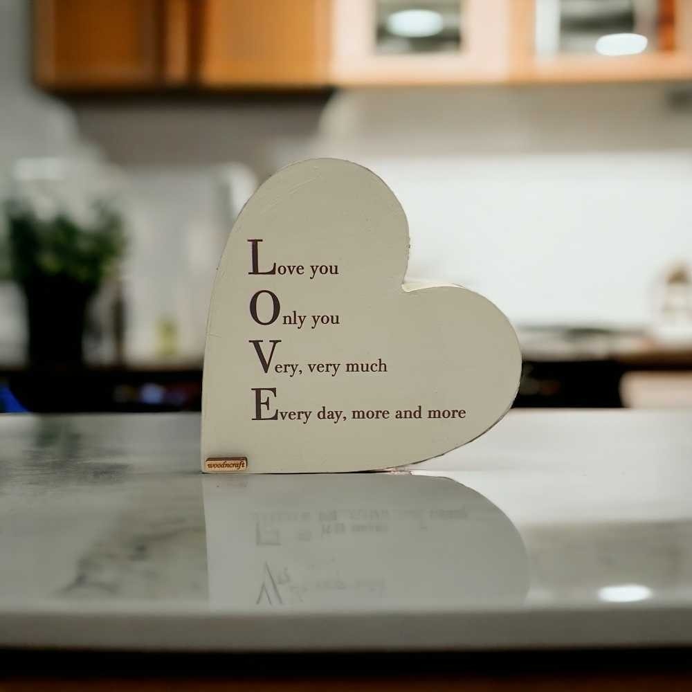 Ξύλινο χειροποίητο αυτοστηριζόμενο διακοσμητικό πλαγιαστή καρδιά υψηλής αισθητικής, με εκτυπωμένη τη λέξη ''love'' και ένα κειμενάκι που αντιστοιχεί στο κάθε γράμμα της λέξης.