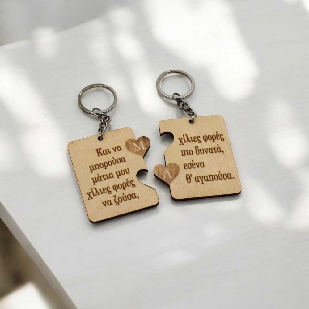 Δημιουργήστε μια ξεχωριστή ανάμνηση με αυτό το σετ ξύλινων μπρελόκ puzzle, χαραγμένο με ρομαντικά μηνύματα και τις προσωπικές σας καρδιές που φέρουν τα αρχικά σας.