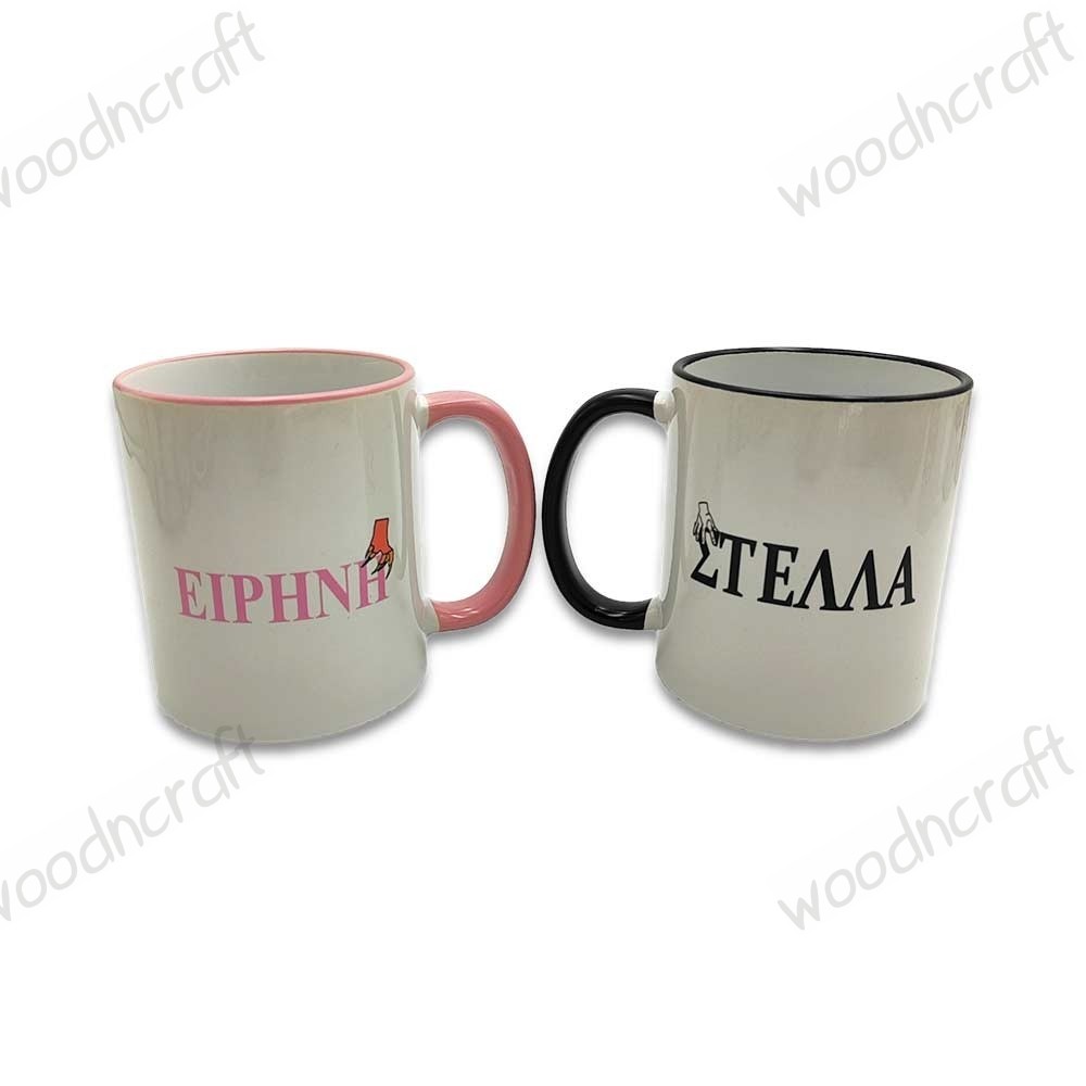 Πρωτότυπο σετ κούπες από λευκή πορσελάνη, η μία με μαύρο χερούλι και η άλλη με ροζ, τυπωμένες με τα ονόματα και την αφιέρωση της επιλογής σας από την μία πλευρά και την Wednesday Addams και την φίλη της την Enid Sinclair από την άλλη πλευρά!