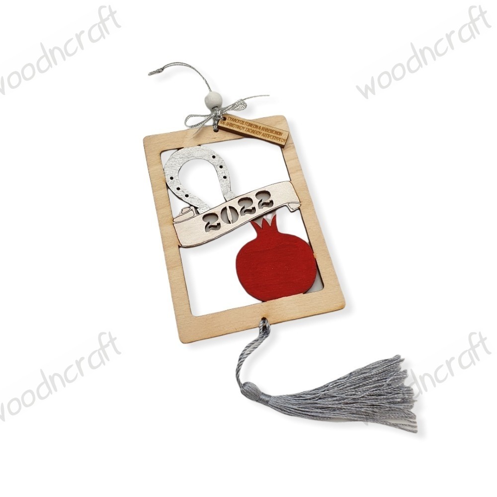Πρωτότυπο ξύλινο χειροποίητο γούρι σε σχέδιο διάτρητο καδράκι με μπανεράκι με τη νέα χρονιά και προσαρμοσμένο ένα πέταλο και ένα ρόδι! Βαμμένο στο χέρι και διακοσμημένο με κορδελάκια ξύλινη χάντρα, κρεμαστή φούντα και ταμπελάκι χαραγμένο με τα στοιχεία σας!