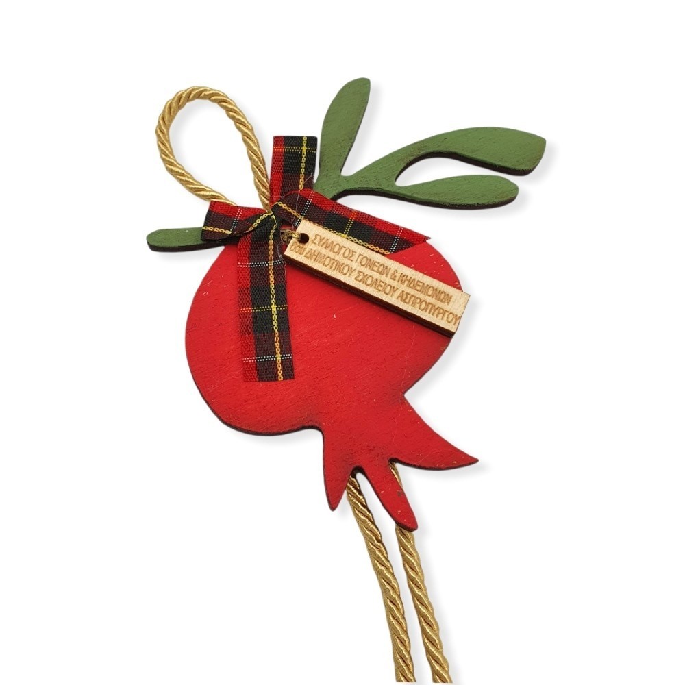Πρωτότυπο ξύλινο χειροποίητο γούρι σε σχέδιο ρόδι με κλωναράκι! Βαμμένο στο χέρι και διακοσμημένο με κορδόνι, χριστουγεννιάτικο φιογκάκι και ταμπελάκι χαραγμένο με τα στοιχεία σας!