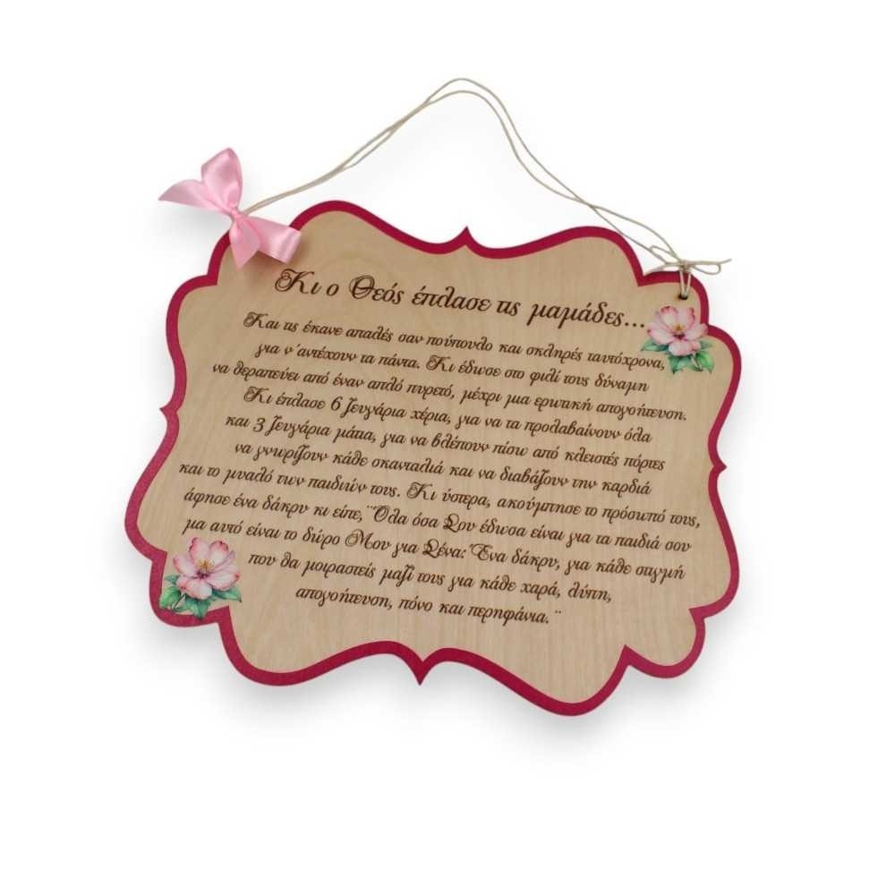 Ξύλινο χειροποίητο διακοσμητικό καδράκι με λουλούδια και χάραξη ένα μοναδικό κειμενάκι για το πως ο Θεός έπλασε τις μανούλες!
