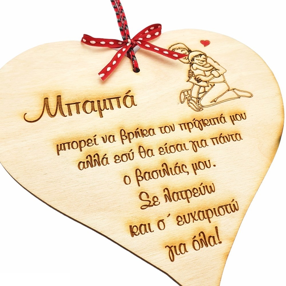 Ξύλινο χειροποίητο κρεμαστό διακοσμητικό σε σχήμα καρδιά με χαραγμένο σκίτσο έναν μπαμπά αγκαλιά με την κόρη του και φυσικά η αφιέρωση της επιλογής σας! Διακοσμημένο με κορδόνι και κορδέλα φιογκάκι!