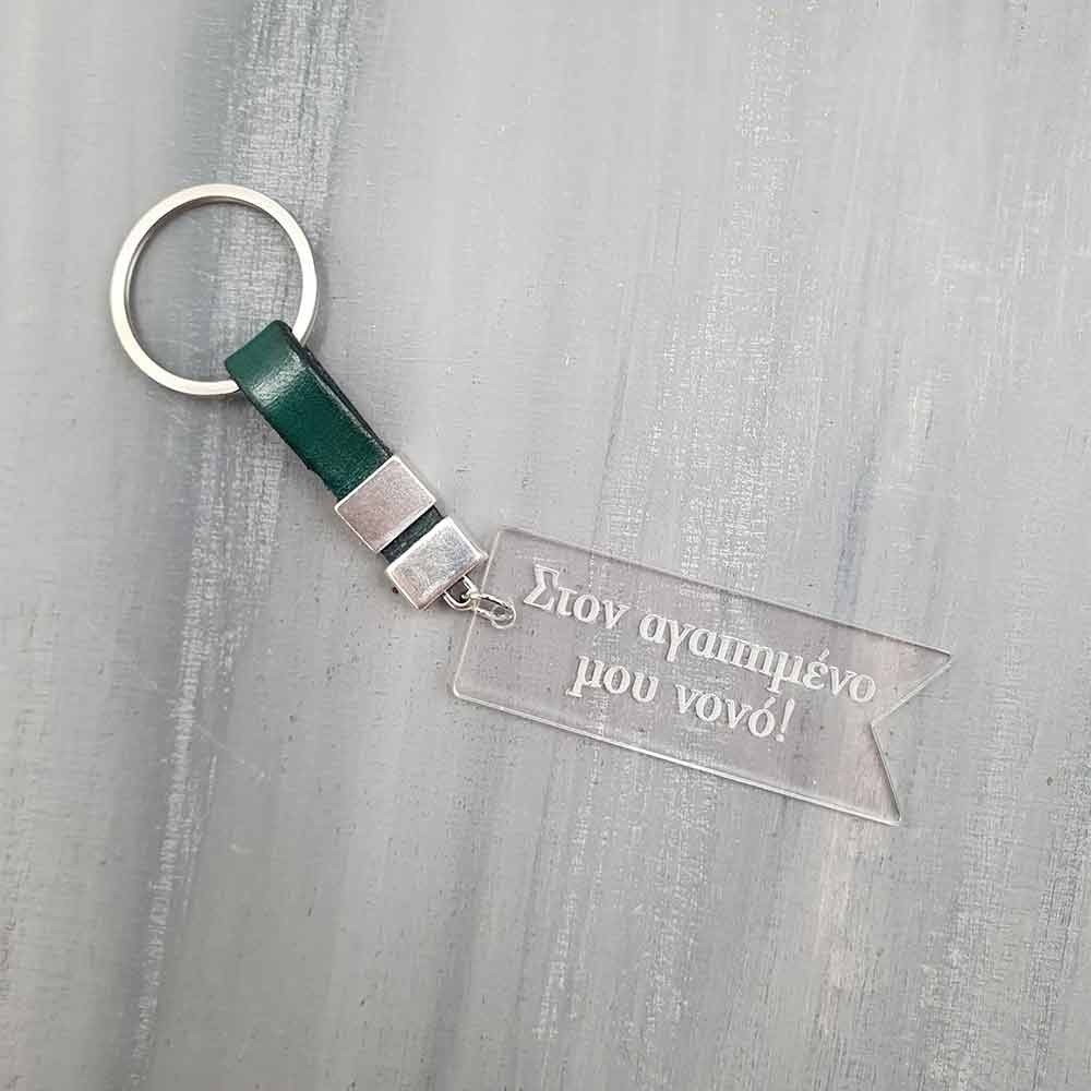 Μοναδικό χειροποίητο μπρελόκ υψηλής αισθητικής φτιαγμένο με πράσινο δερμάτινο λουράκι και ένα διάφανο πλεξιγκλάς στοιχείο, με αφιέρωση της επιλογής σας! Φτιαγμένο με κρίκο και μεταλλικά κουμπώματα σε ασημί απόχρωση!