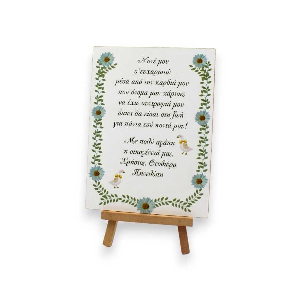 Με UV εκτύπωση υψηλής ποιότητας και μέγεθος 20 cm, το καδράκι στηρίζεται σε ξύλινο καβαλέτο, προσδίδοντας σταθερότητα και αισθητική. Μπορεί να προσωποποιηθεί με το κείμενο της επιλογής σας, καθιστώντας το δώρο ακόμα πιο προσωπικό. Είναι ιδανικό για να διακοσμήσει μια βάπτιση με ρομαντικό θέμα, αλλά και ως δώρο που θα μείνει αξέχαστο στη νονά ή τον νονό.