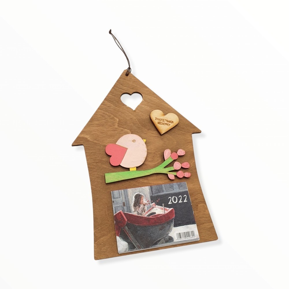 Πρωτότυπο ξύλινο χειροποίητο ημερολόγιο σε σχέδιο σπιτάκι διακοσμημένο με ένα κλαδί με πουλάκι και μια καρδιά με χάραξη της επιλογής σας! Ειδικές τιμές σε ποσότητες. Ιδανικά για σχολεία, συλλόγους κάθε είδους αλλά και επαγγελματίες.