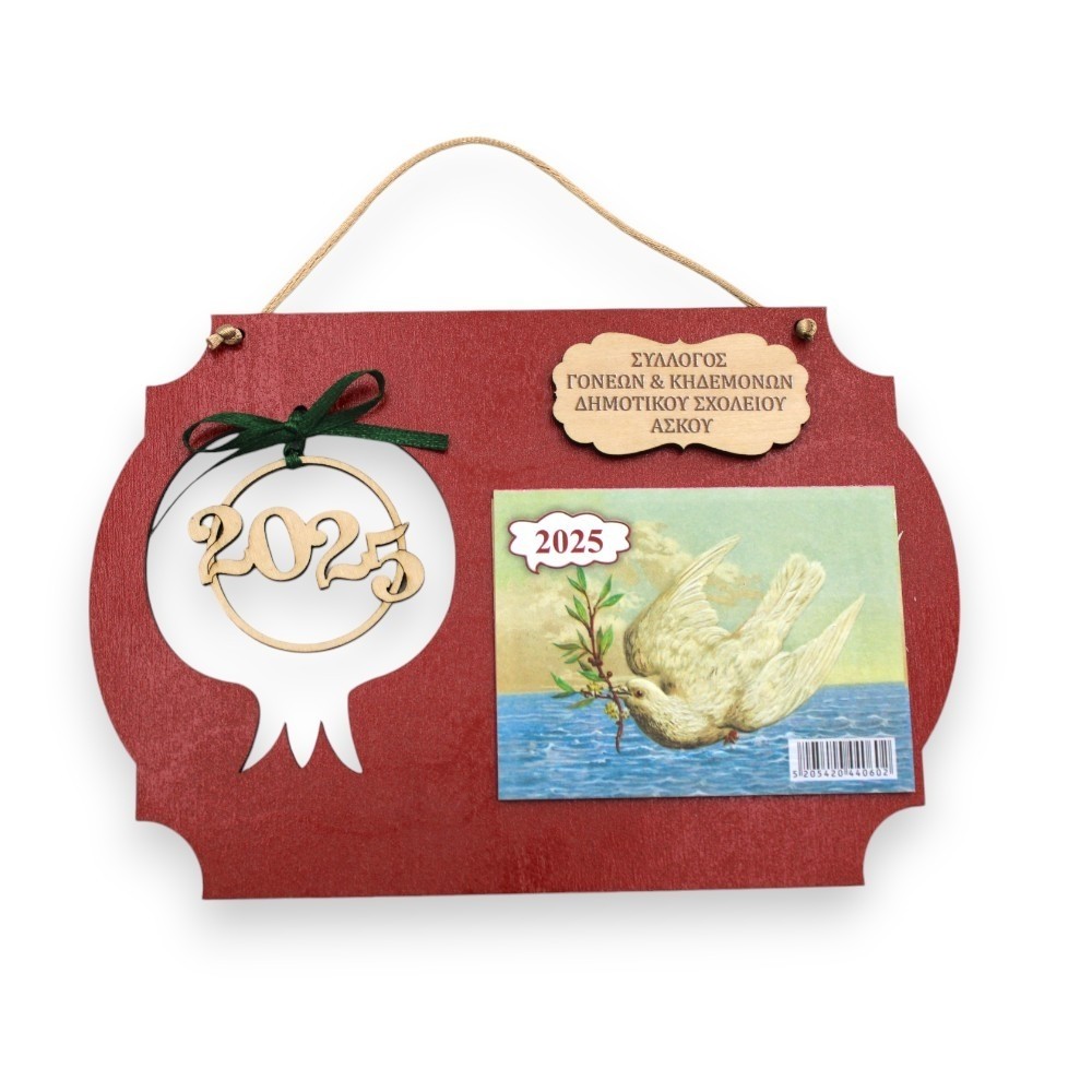 Πρωτότυπο και ξεχωριστό χειροποίητο ημερολόγιο με διάτρητο το ρόδι της τύχης και κρεμαστό 2025 δεμένο με φιογκάκι! Ιδανικά για σχολεία, συλλόγους κάθε είδους αλλά και επαγγελματίες. Στο ταμπελάκι μπορεί να χαραχτεί ο σύλλογος, το σχολείο ή μια αφιέρωση της επιλογής σας.