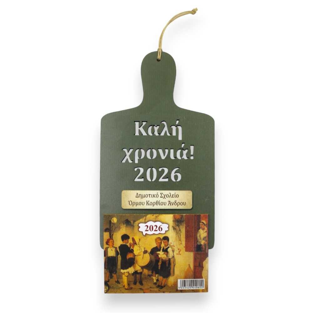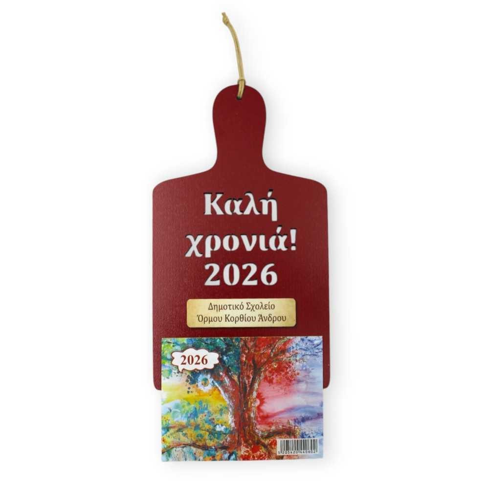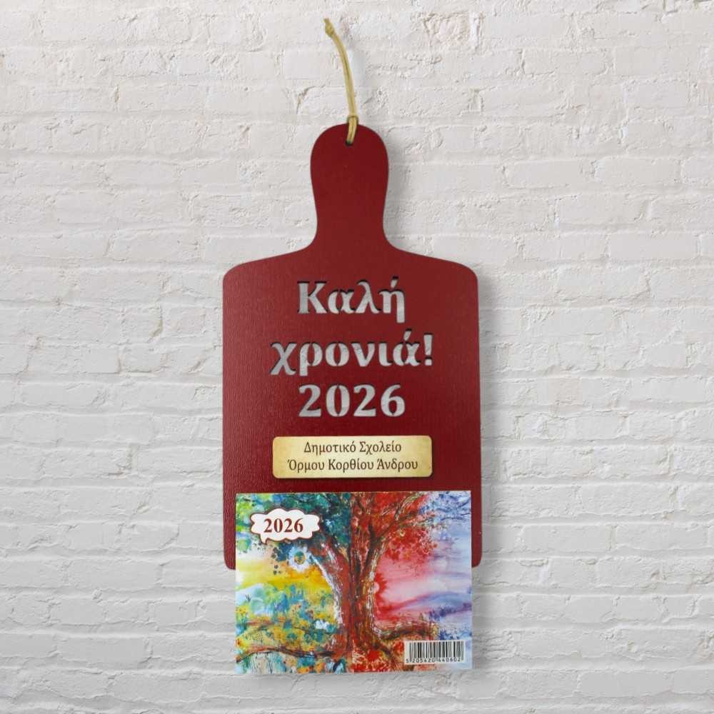 Πρωτότυπο ξύλινο χειροποίητο ημερολόγιο σε σχέδιο ξύλο κοπής με διάτρητη την χρονολογία του νέου έτους συνοδευόμενη με την ευχή Καλή Χρονιά, χρωματισμένο στο χέρι και προσωποποιημένο με ταμπελάκι χαραγμένο με τον σύλλογο, το σχολείο, την επιχείρηση ή μια αφιέρωση της επιλογής σας!