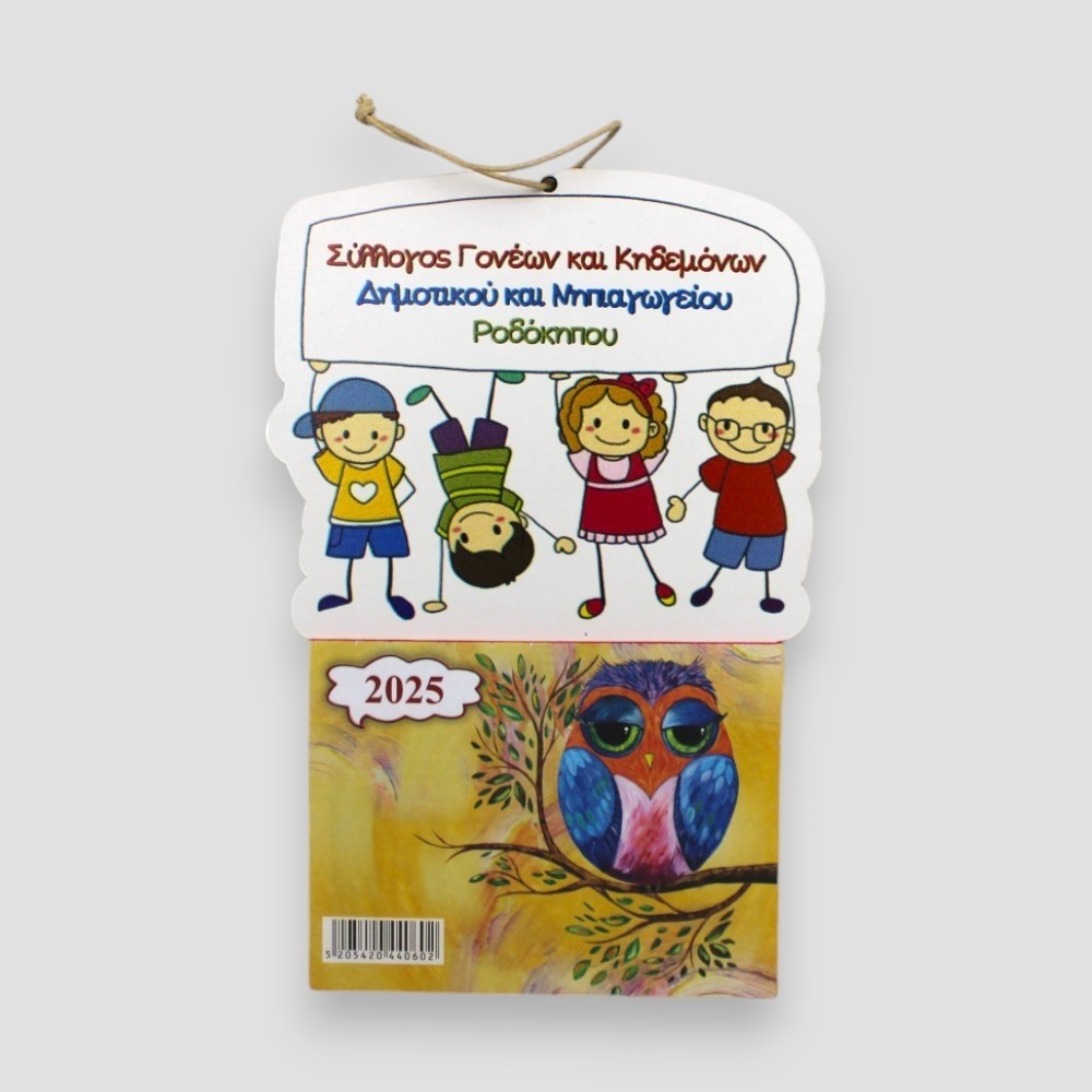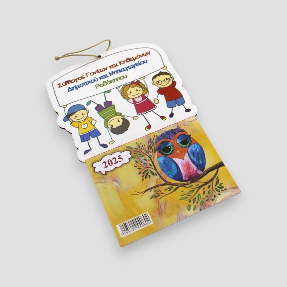Το Ξύλινο ημερολόγιο - Παιδάκια με πανό είναι ένα χειροποίητο κρεμαστό ημερολόγιο, ειδικά σχεδιασμένο για σχολεία και συλλόγους. Απεικονίζει τέσσερα χαρούμενα παιδάκια που κρατάνε ένα πανό, μέσα στο οποίο μπορεί να τυπωθεί το όνομα του συλλόγου, σχολείου ή της επιχείρησης σας. Το ημερολόγιο έχει μέγεθος 11cm και εκτύπωση UV για ανθεκτικότητα και ζωντάνια στα χρώματα.