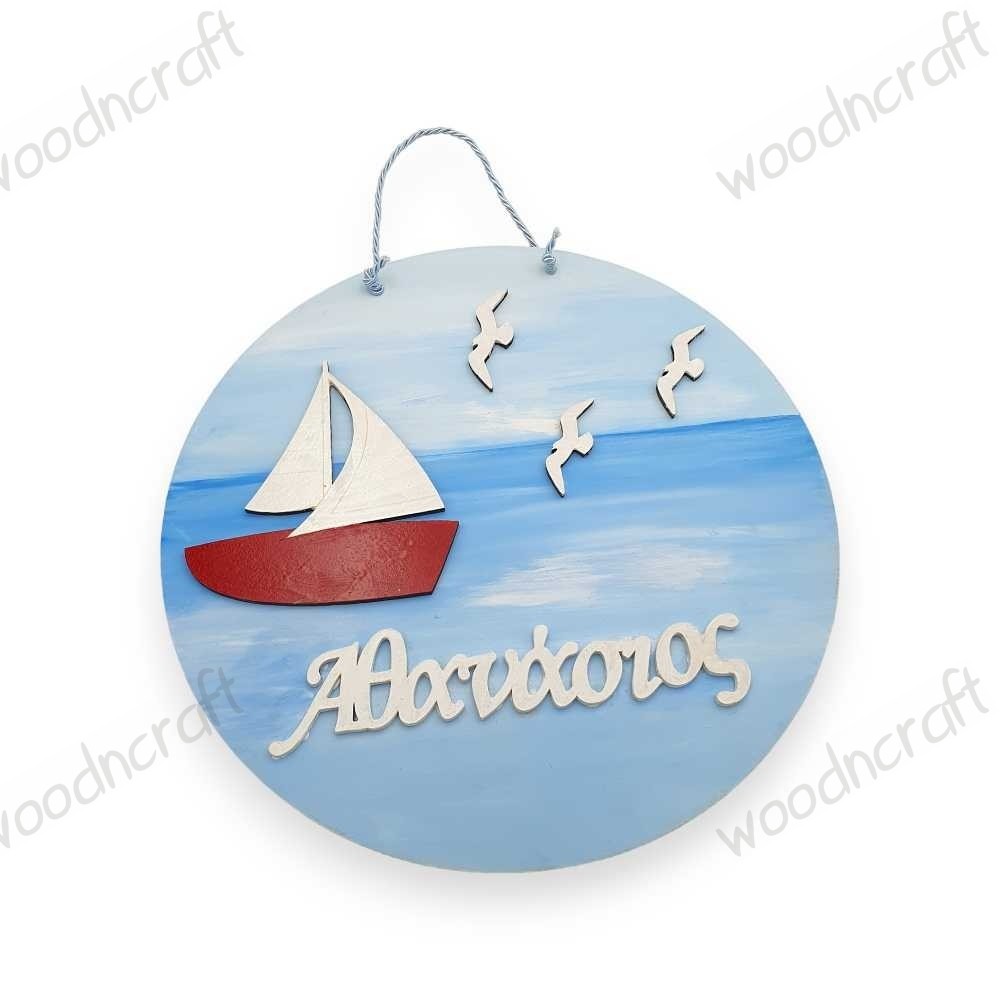 Ένα όμορφα σχεδιασμένο καραβάκι πλέει ήρεμα στη θάλασσα, ενώ γλάροι πετάνε ελεύθερα στον ουρανό. Το όνομα του παιδιού, προσεκτικά σχεδιασμένο, προσφέρει μια προσωπική νότα που το κάνει το τέλειο δώρο για γενέθλια, βάφτιση ή απλά για να προσθέσετε ένα ιδιαίτερο στοιχείο στο δωμάτιο.