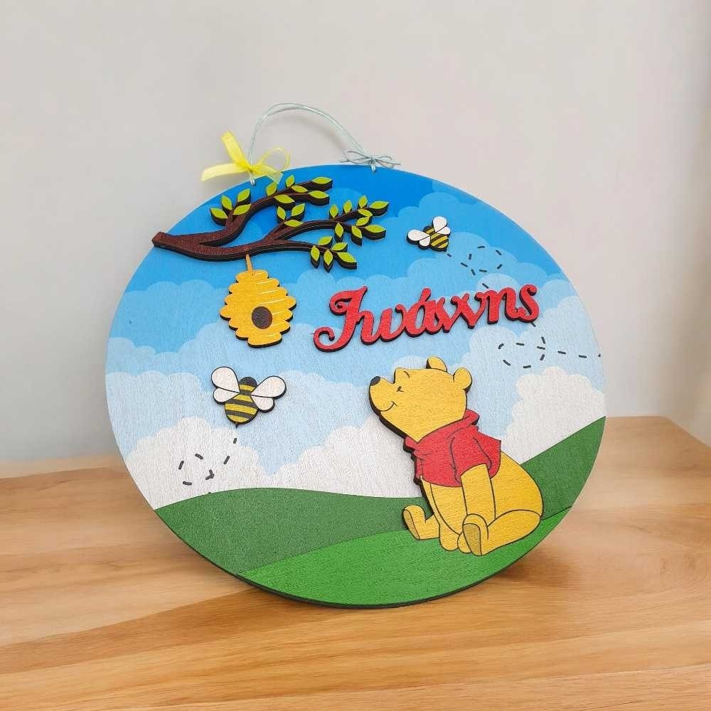 Στο κέντρο του κάδρου, ο αγαπημένος Γουίνι κάθεται σε ένα όμορφο φυσικό τοπίο, κάτω από ένα κλαδί από το οποίο κρέμεται μια κυψέλη, ενώ δύο μέλισσες πετούν τριγύρω. Πάνω από τον Γουίνι, είναι τοποθετημένο το όνομα του παιδιού, καθιστώντας το δώρο αυτό μοναδικό και προσωπικό. Το κάδρο διαθέτει σχοινάκι για εύκολη ανάρτηση και είναι διακοσμημένο με ένα κίτρινο φιογκάκι, προσθέτοντας μια επιπλέον νότα χαράς.