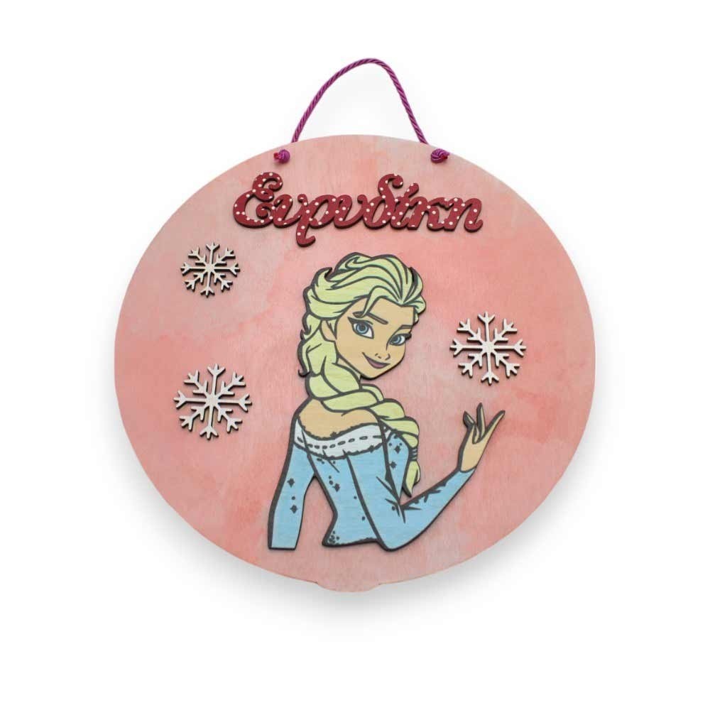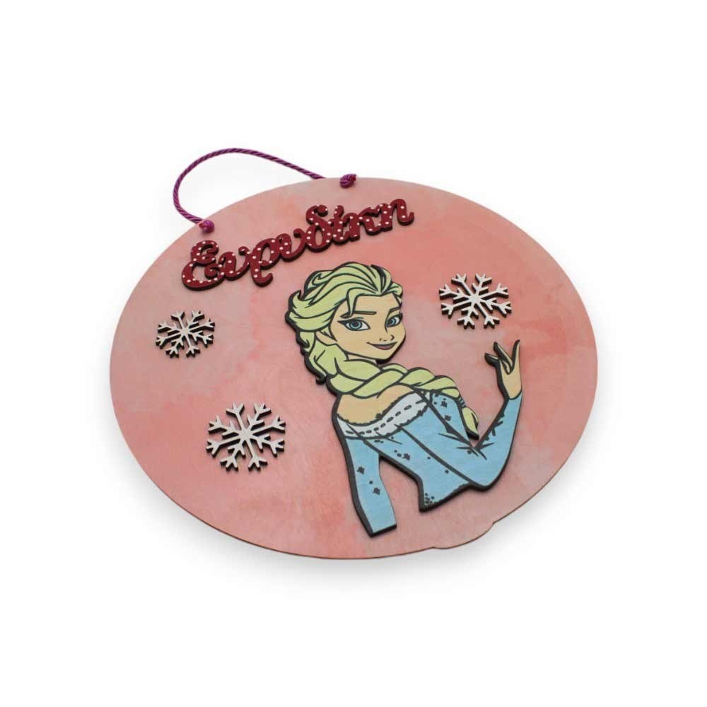 Η πίσω επιφάνεια λειτουργεί ως φόντο, ενώ πάνω της τοποθετούνται η φιγούρα της αγαπημένης Έλσας, τρεις χιονονιφάδες και το όνομα του παιδιού, κάνοντας το διακοσμητικό μοναδικό και προσωπικό. Η εκτύπωση UV εξασφαλίζει ζωντανά χρώματα και ανθεκτικότητα στο χρόνο.
