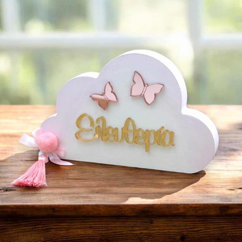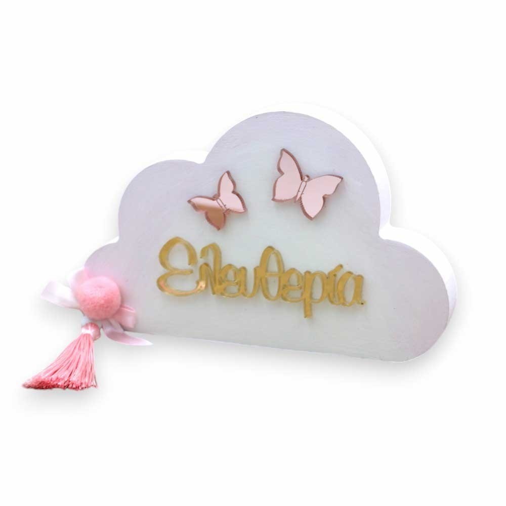 Το Χειροποίητο επιτραπέζιο διακοσμητικό είναι κατασκευασμένο από ξύλο σε σχήμα σύννεφου σε διάσταση 18x11 εκατοστά. Στο κέντρο του έχει ένα όνομα από χρυσό καθρέφτη plexiglass και δύο πεταλουδίτσες από rose gold plexiglass. Στο κάτω μέρος είναι διακοσμημένο με μια ροζ φούντα, κορδελάκι και πον πον.