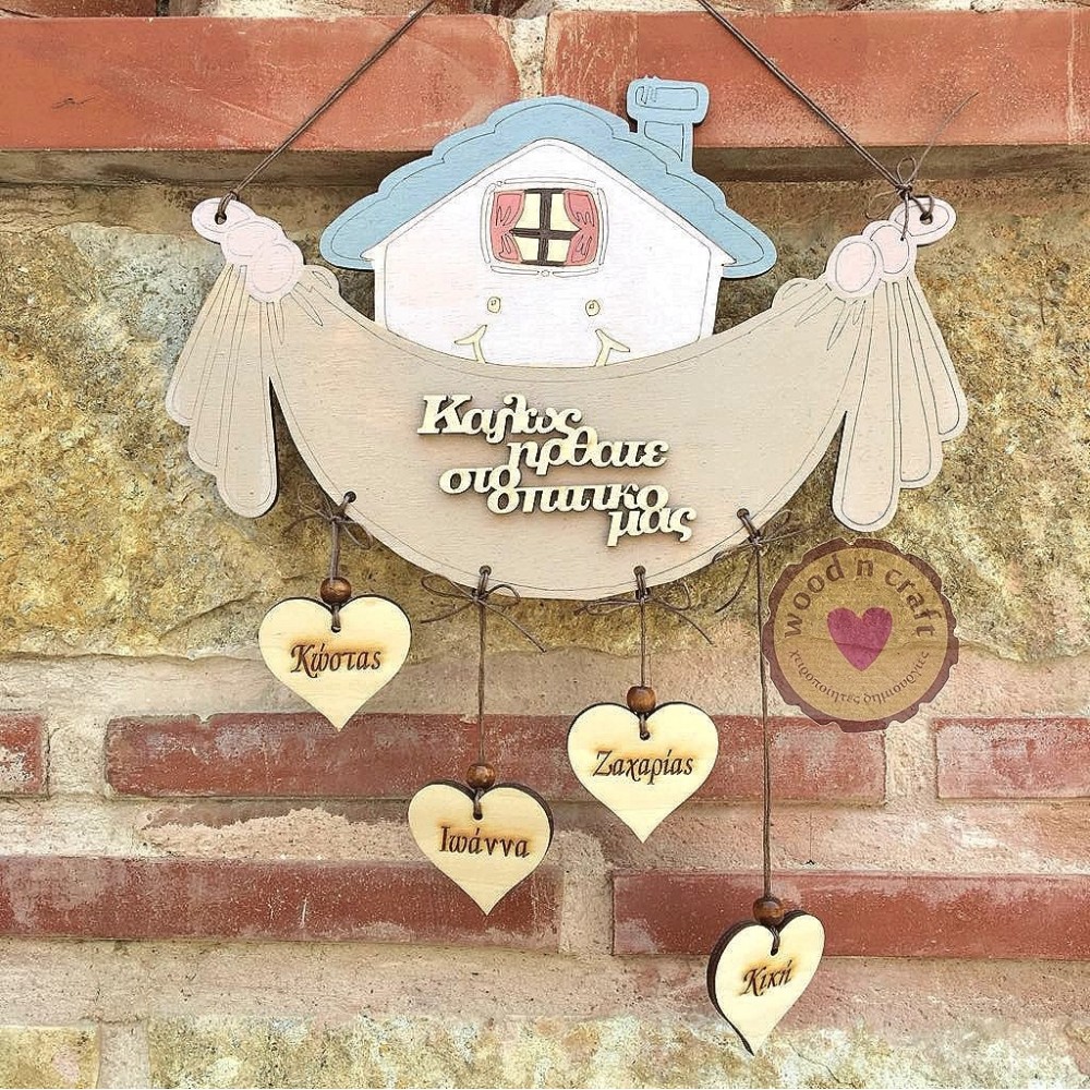 Ξύλινο χειροποίητο διακοσμητικό πόρτας ή τοίχου σε σχέδιο σπιτάκι.. με κρεμαστές καρδιές οι οποίες έχουν χαραγμένα τα ονόματα της οικογένειας σας.. και ένα γλυκό καλωσόρισμα! Βαμμένο στο χέρι σε χρώματα της επιλογής σας.