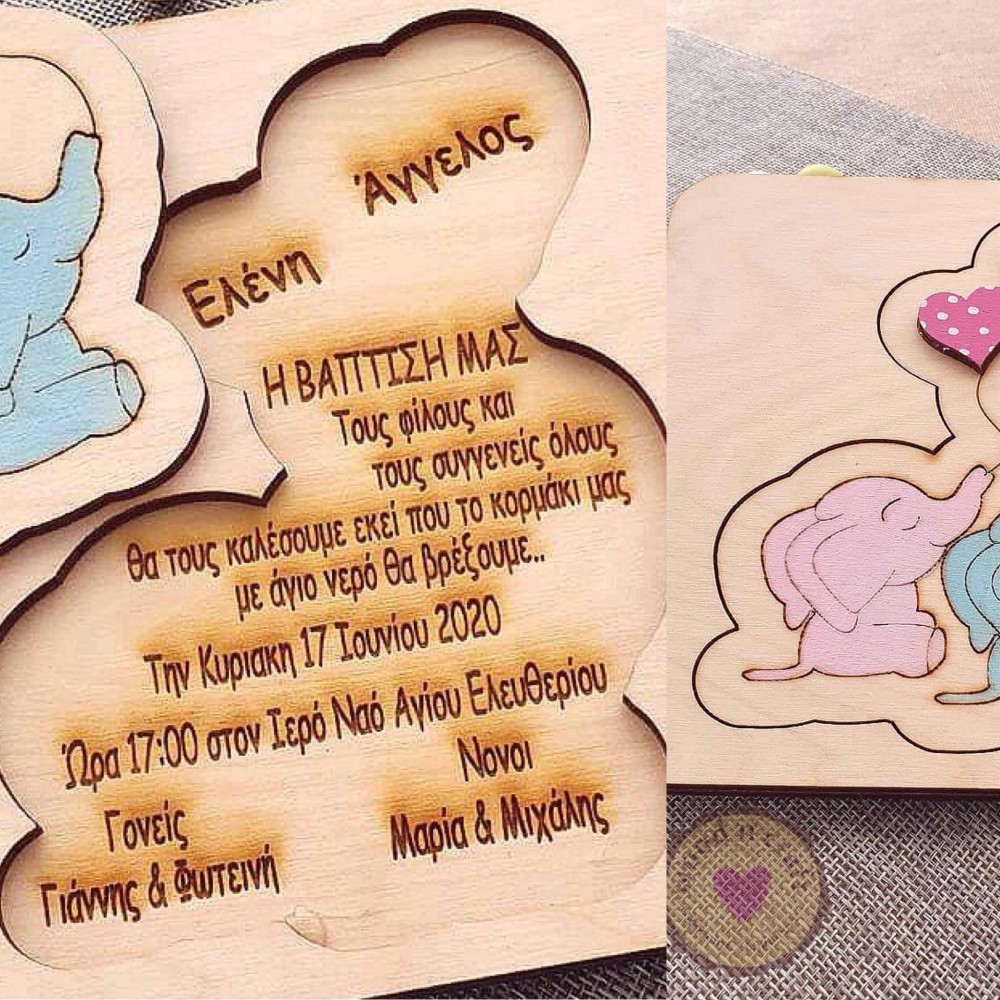 Πρωτότυπο και μοναδικό ξύλινο προσκλητήριο βάπτισης παζλ σε σχέδιο δίδυμα ελεφαντάκια. Αφαιρούμε τα ελεφαντάκια και ανακαλύπτουμε χαραγμένο το κειμενάκι πρόσκλησης μαζί με τα στοιχεία της βάπτισης, βάζουμε τα ελεφαντάκια στην θέση του και δημιουργούμε ένα όμορφο παιδικό διακοσμητικό!