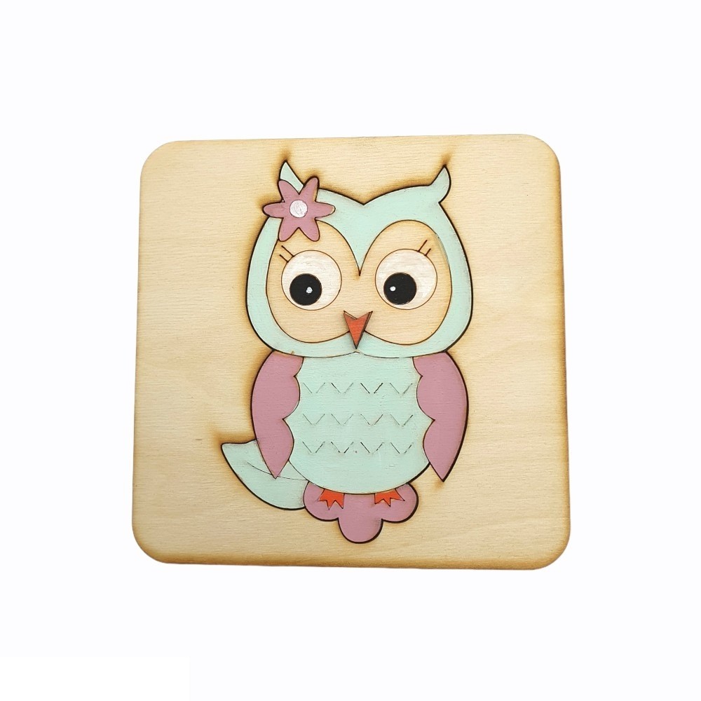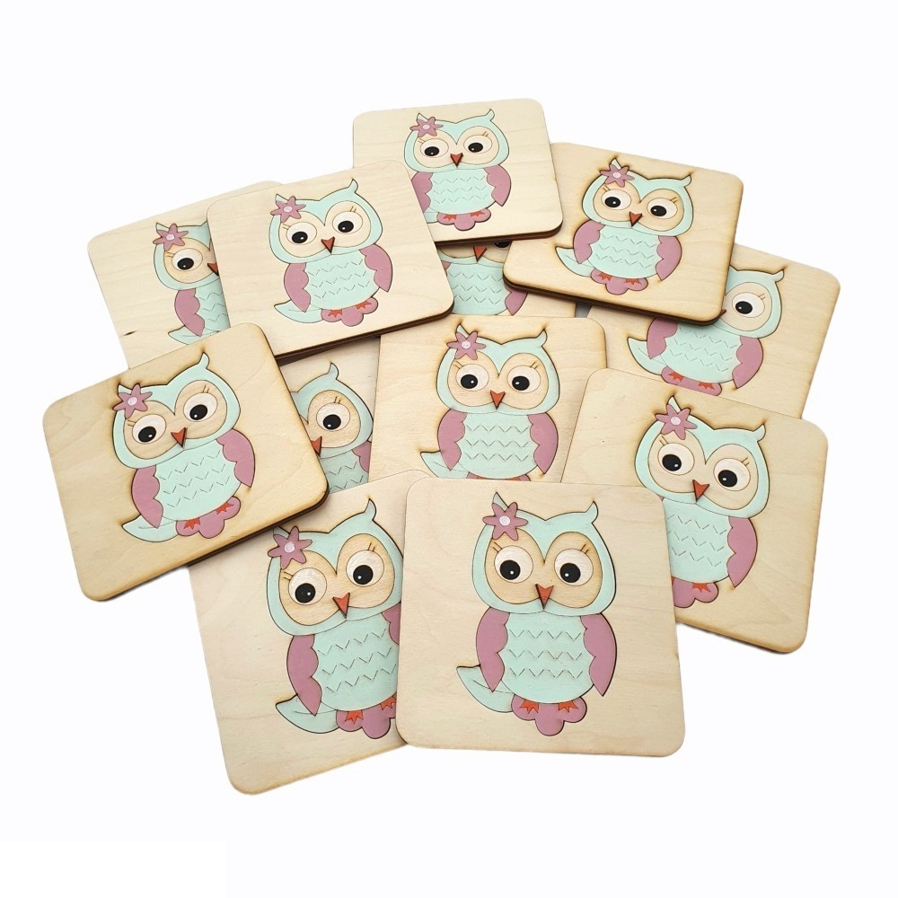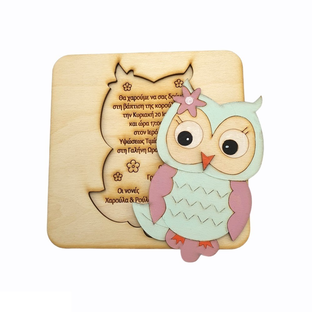Πρωτότυπο και μοναδικό ξύλινο προσκλητήριο βάπτισης παζλ σε σχέδιο κουκουβάγια κοριτσάκι. Αφαιρούμε την κουκουβάγια και ανακαλύπτουμε χαραγμένο το κειμενάκι πρόσκλησης μαζί με τα στοιχεία της βάπτισης, βάζουμε την κουκουβάγια στη θέση της και δημιουργούμε ένα όμορφο παιδικό διακοσμητικό!
