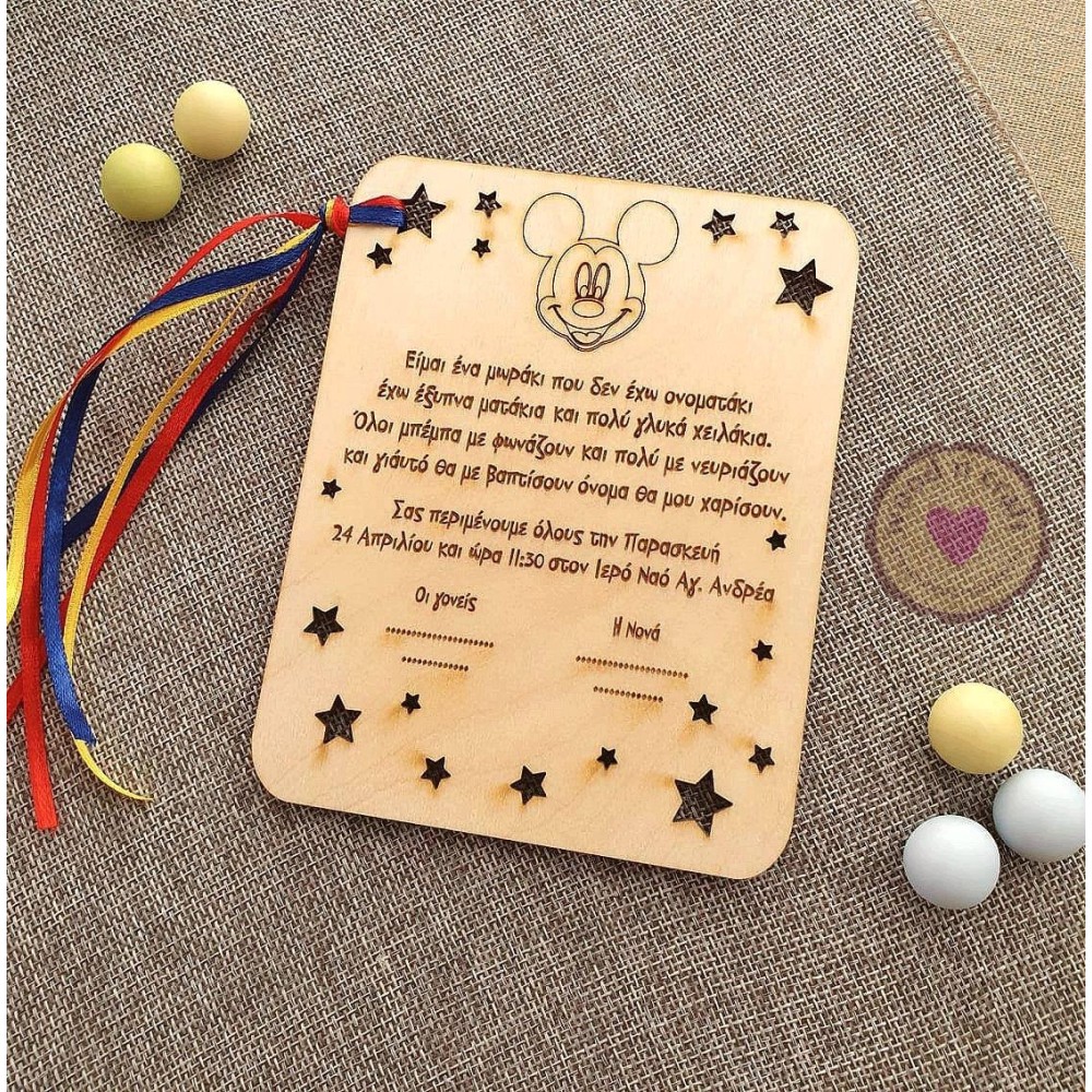 Πρωτότυπο και μοναδικό ξύλινο προσκλητήριο - καδράκι σε σχέδιο Μίκυ Μάους! Το πιο ξεχωριστό ξύλινο προσκλητήριο διπλής όψης με τον αγαπημένο παιδικό ήρωα και χαραγμένο το κείμενο της βάφτισής σας.