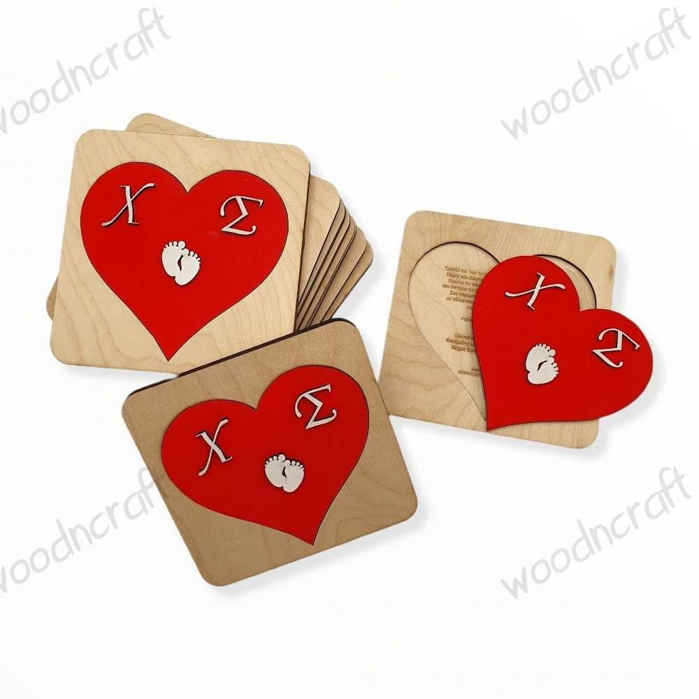 Πρωτότυπο ξύλινο προσκλητήριο βάπτισης, γάμου ή και τα δύο μαζί, σε σχέδιο παζλ καρδιά με τα μονογράμματα σας αν αφορά γάμο και πατουσάκια για το μωράκι. Αφαιρούμε την καρδούλα και ανακαλύπτουμε χαραγμένο το κειμενάκι πρόσκλησης μαζί με τα στοιχεία της βάπτισης - γάμου, βάζουμε την καρδιά στην θέση της και δημιουργούμε ένα όμορφο διακοσμητικό!