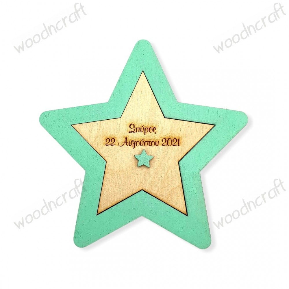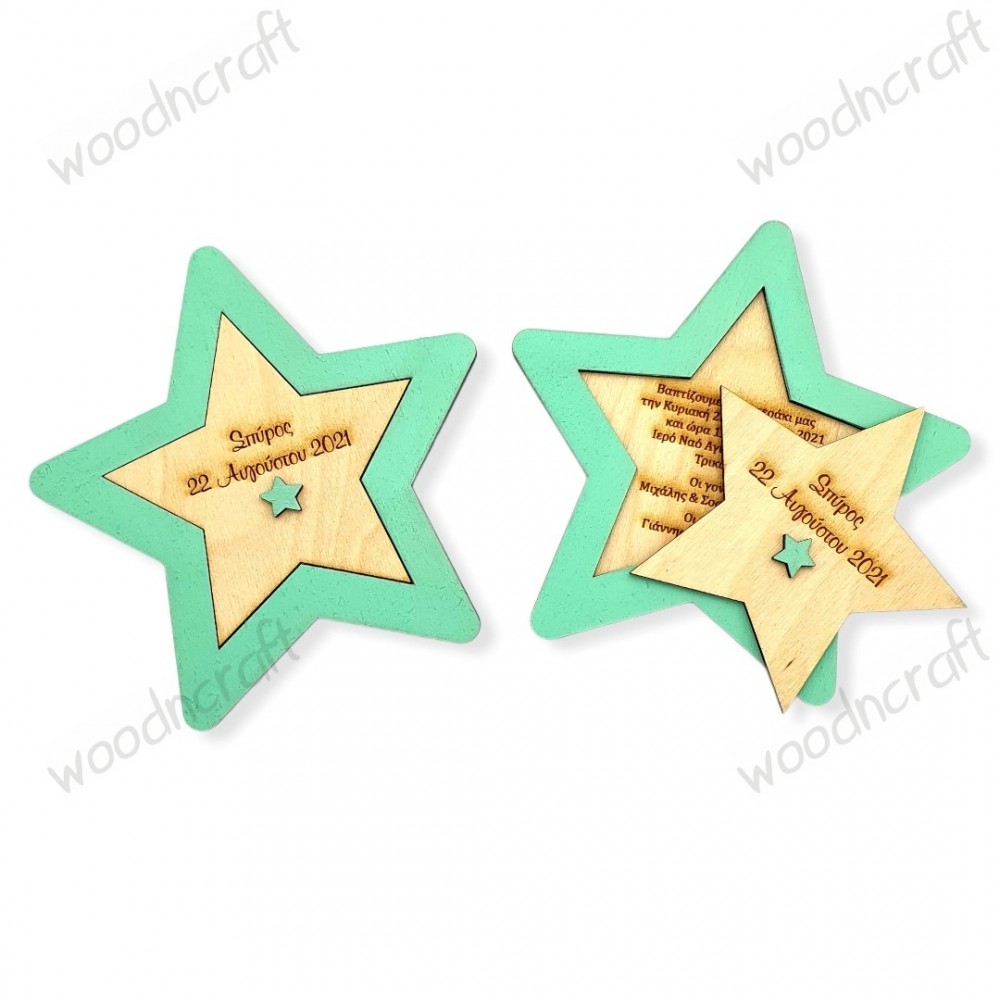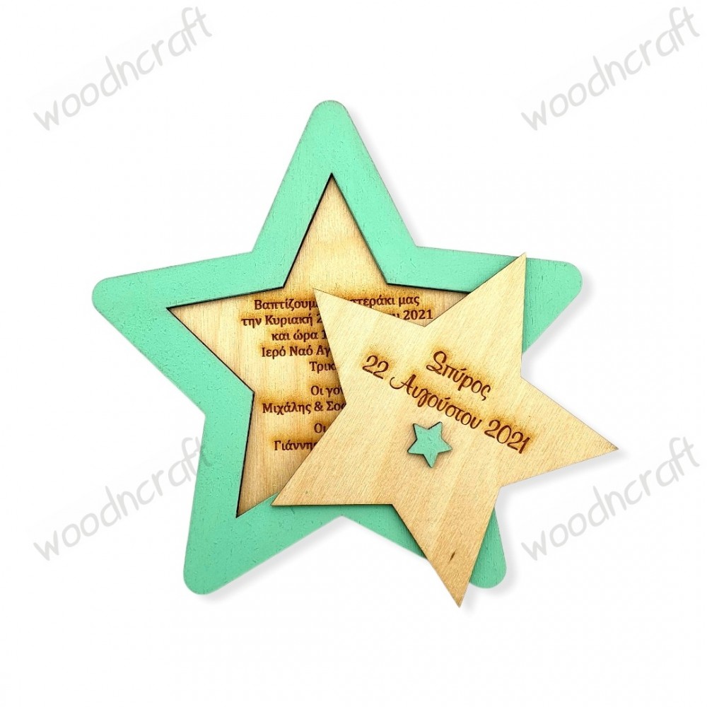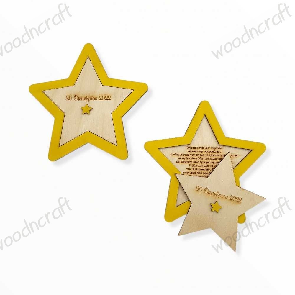 Πρωτότυπο και μοναδικό ξύλινο προσκλητήριο βάπτισης παζλ σε σχέδιο αστέρι. Αφαιρούμε το αστεράκι και ανακαλύπτουμε χαραγμένο το κειμενάκι πρόσκλησης μαζί με τα στοιχεία της βάπτισης, βάζουμε το αστέρι στην θέση του και δημιουργούμε ένα όμορφο παιδικό διακοσμητικό!